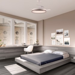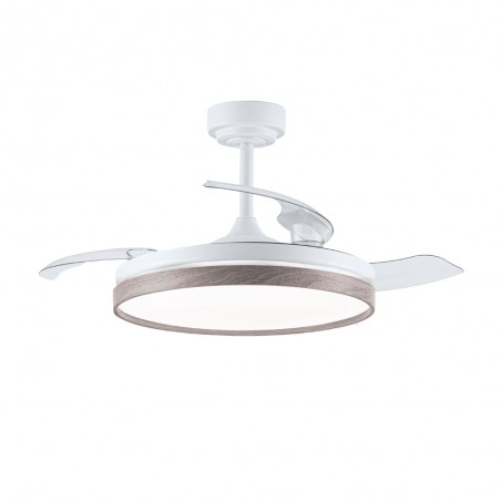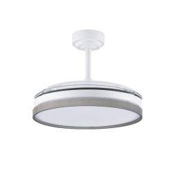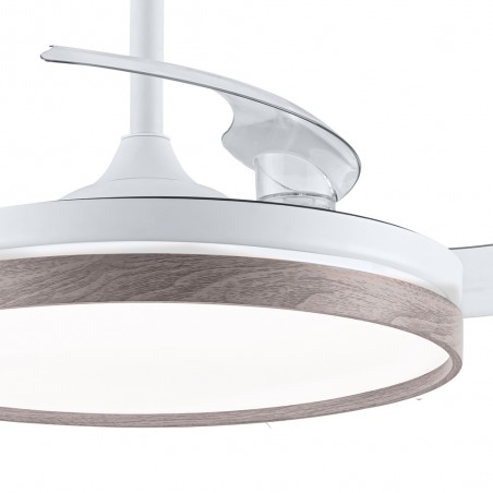 Panam LED ceiling fan with retractable blades. Modern white fan with a practical design that allows both ventilation and illumination of the room. It has integrated LED lighting with dimmable lumens intensity and three colour temperatures (3000-4000-6000K). In addition, with the remote control you can select the breeze function, a night light mode or set the fan to switch off after 2-4 hours. Ultra-quiet DC motor with six rotation speeds and winter-summer reverse function. White fan with ash grey wood effect decoration. Transparent retractable blades.