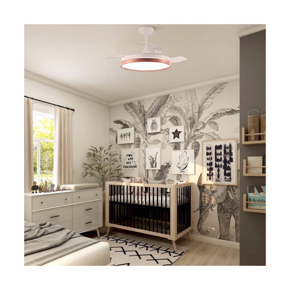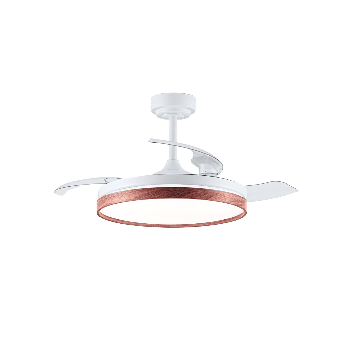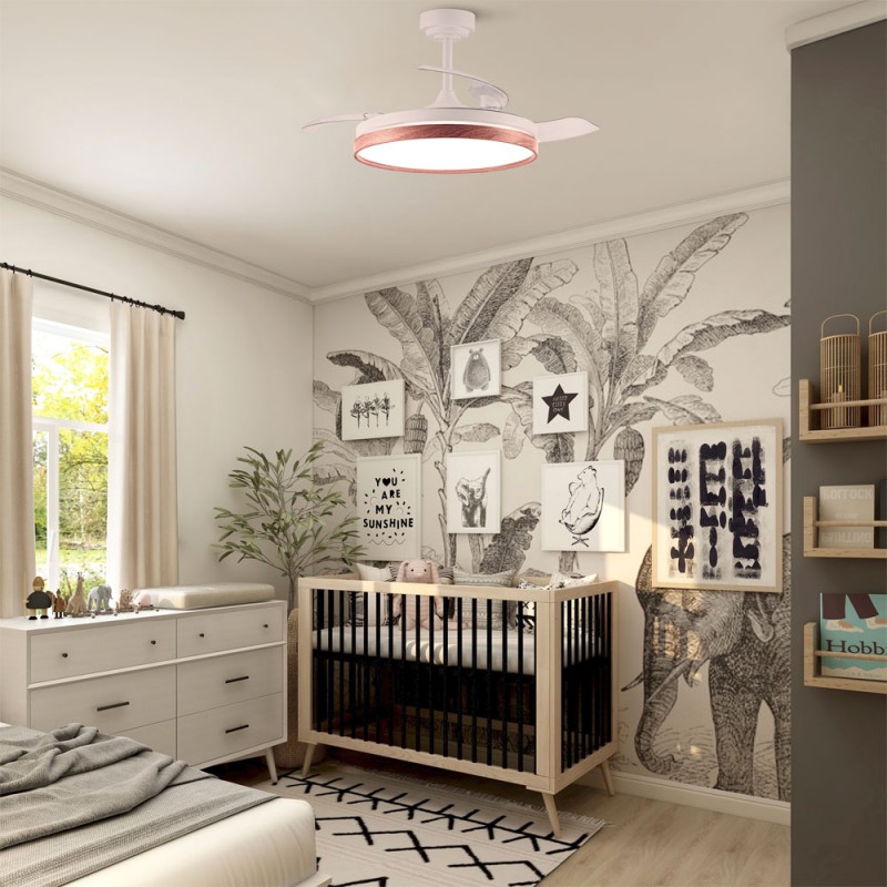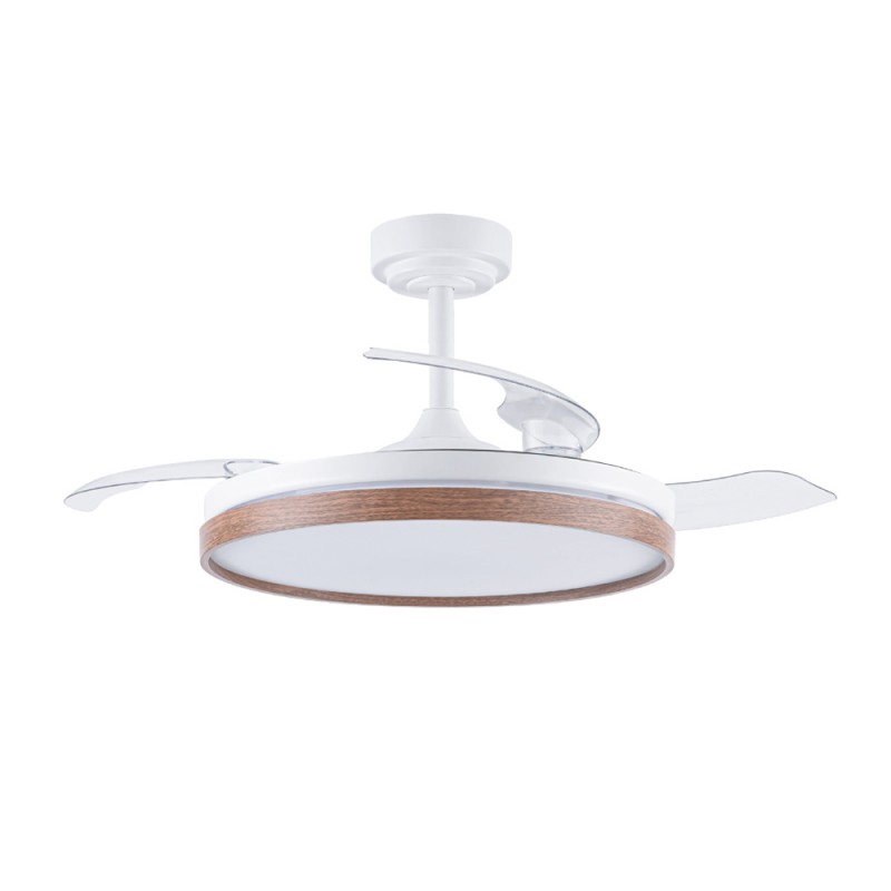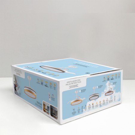 Panam LED ceiling fan with retractable blades. Modern white fan with a practical design that allows both ventilation and illumination of the room. It has integrated LED lighting with dimmable lumens intensity and three colour temperatures (3000-4000-6000K). In addition, with the remote control you can select the breeze function, a night light mode or set the fan to switch off after 2-4 hours. Ultra-quiet DC motor with six rotation speeds and winter-summer reverse function. White fan with cherry wood effect decoration. Transparent retractable blades.