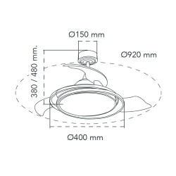 Antila Mini LED ceiling fan in white. Fan with ultra-quiet DC motor with six rotation speeds, reverse function winter summer and breeze. Its design with retractable blades means that when the fan is not in operation, the blades are retracted on top of the fan. You can turn on just the main light, just the decorative ring or the whole fan at the same time with the remote control.