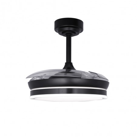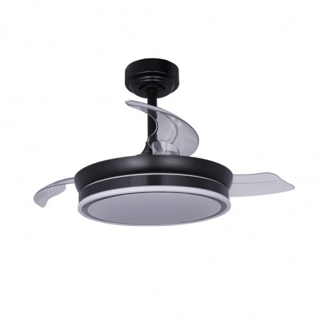 LED Mini Moss ceiling fan for small rooms. Ceiling fan with retractable blades designed to provide airflow and lighting in bedrooms and small living rooms. It has an ultra-quiet motor with 6 rotation speeds, reverse winter-summer function, timer and breeze function. As for the lighting, you can set three lighting tones (warm, neutral or cold) and dim the intensity of lumens. The body of the fan is black and the folding blades are transparent.