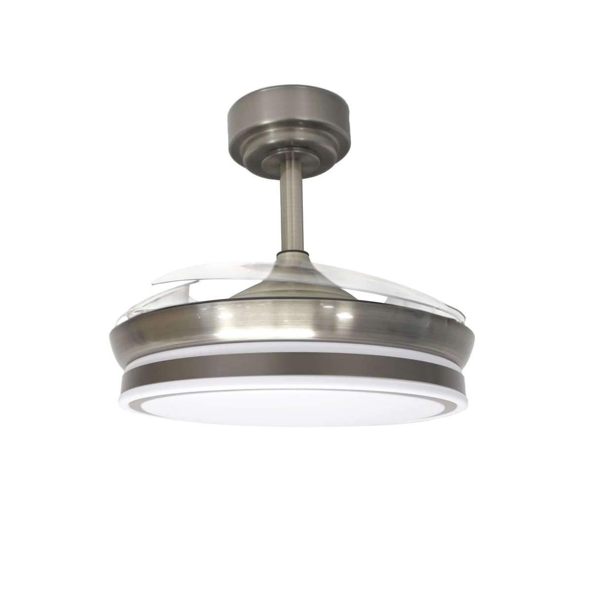 LED Mini Moss ceiling fan for small rooms. Ceiling fan with retractable blades designed to provide airflow and lighting in bedrooms and small living rooms. It has an ultra-quiet motor with 6 rotation speeds, reverse winter-summer function, timer and breeze function. As for the lighting, you can set three lighting tones (warm, neutral or cold) and dim the intensity of lumens. The body of the fan is nickel and the folding blades are transparent.
