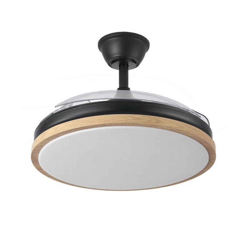Panam LED ceiling fan with retractable blades. Modern black fan with a practical design that allows both ventilation and illumination of the room. It has integrated LED lighting with dimmable lumens intensity and three colour temperatures (3000-4000-6000K). In addition, with the remote control you can select the breeze function, a night light mode or set the fan to switch off after 2-4 hours. Ultra-quiet DC motor with six rotation speeds and winter-summer reverse function. Black fan with wood effect decoration. Transparent retractable blades.