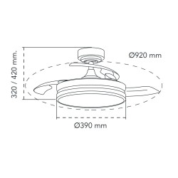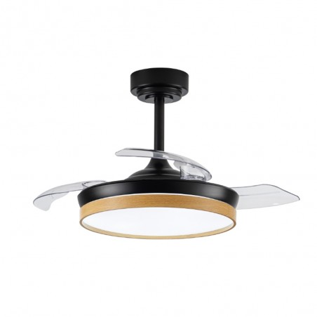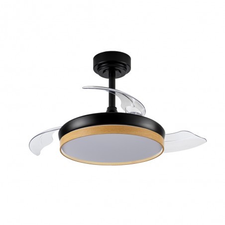 Panam Mini LED ceiling fan for small rooms. Ceiling fan with retractable blades designed to provide airflow and lighting in bedrooms and small living rooms. It has an ultra-quiet motor with 6 rotation speeds, reverse winter-summer function, timer and breeze function. As for the lighting, you can set three lighting tones (warm, neutral or cold) and dim the intensity of lumens. Black fan with light wood effect decoration. Transparent retractable blades.