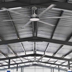 Avon large-size ceiling fan. Ceiling fan with six blades and a diameter of 180 centimetres. Designed for installation in industrial premises and large indoor spaces. Steel motor, aluminium blades and PMMA diffuser. Remote control to control the fan and the lighting. DC motor.