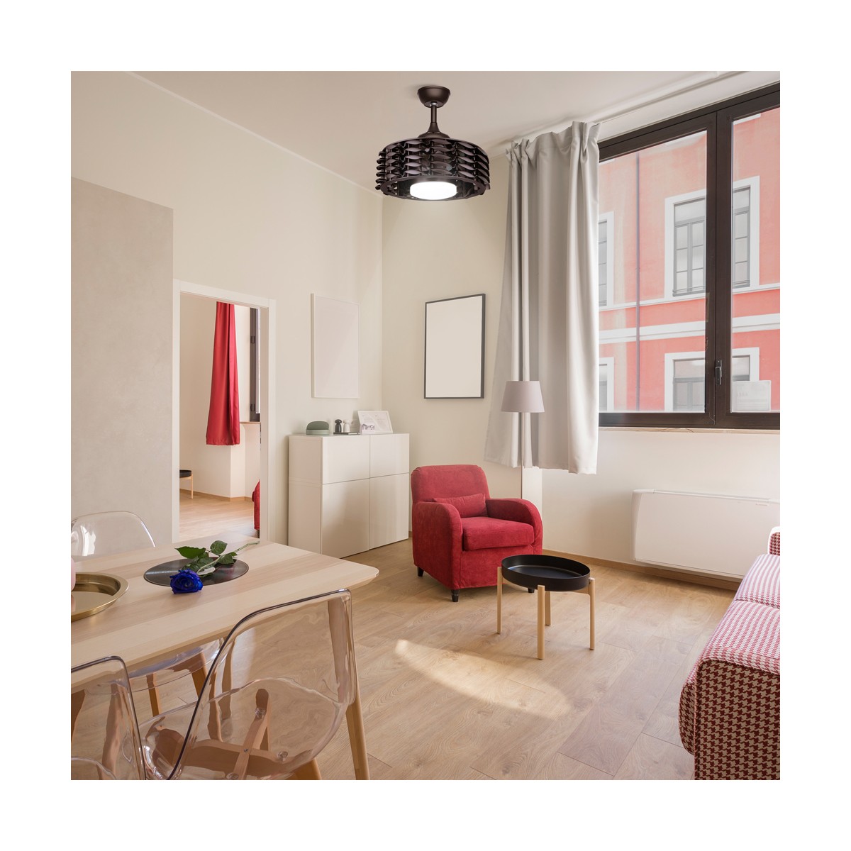 Alum Collection Ceiling fan with light in black finish has a silent DC motor ceiling fan. Its motor allows to reduce the energy consumption and at the same time to achieve a lower noise in its running. It includes two rods of 12.5 and 25 cm. It has integrated 24W, 2410lm LED lighting with three light colours (warm light, neutral light and cold light). The included remote control has a timer function for programming the switch-off after 1-2-4-8 hours.