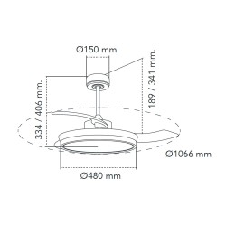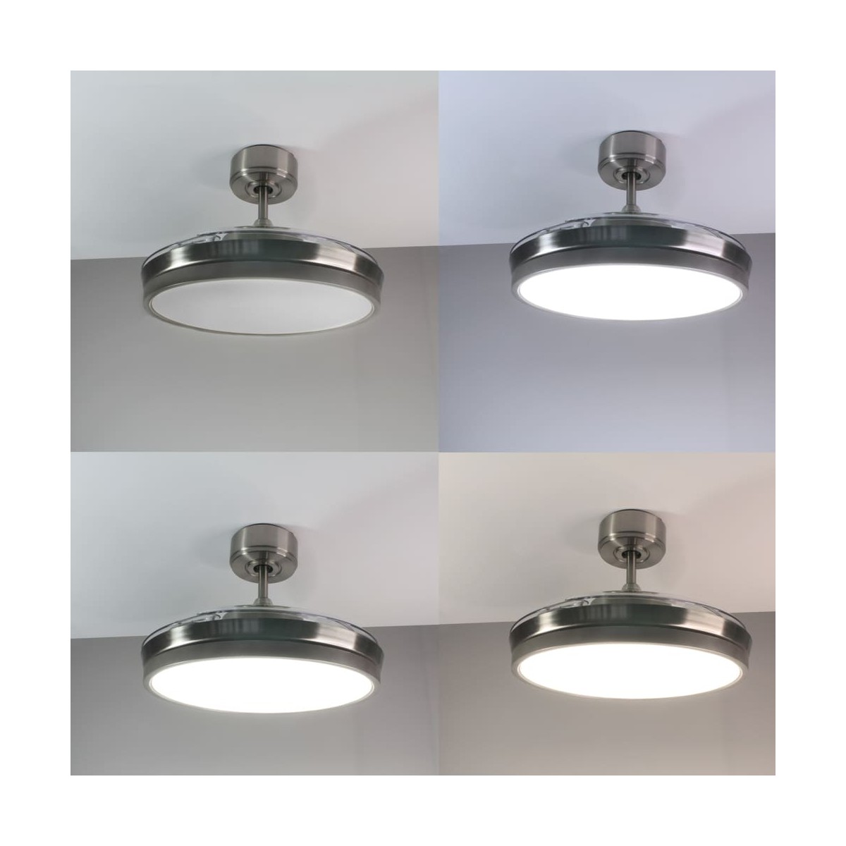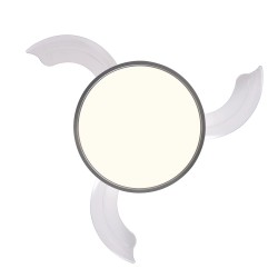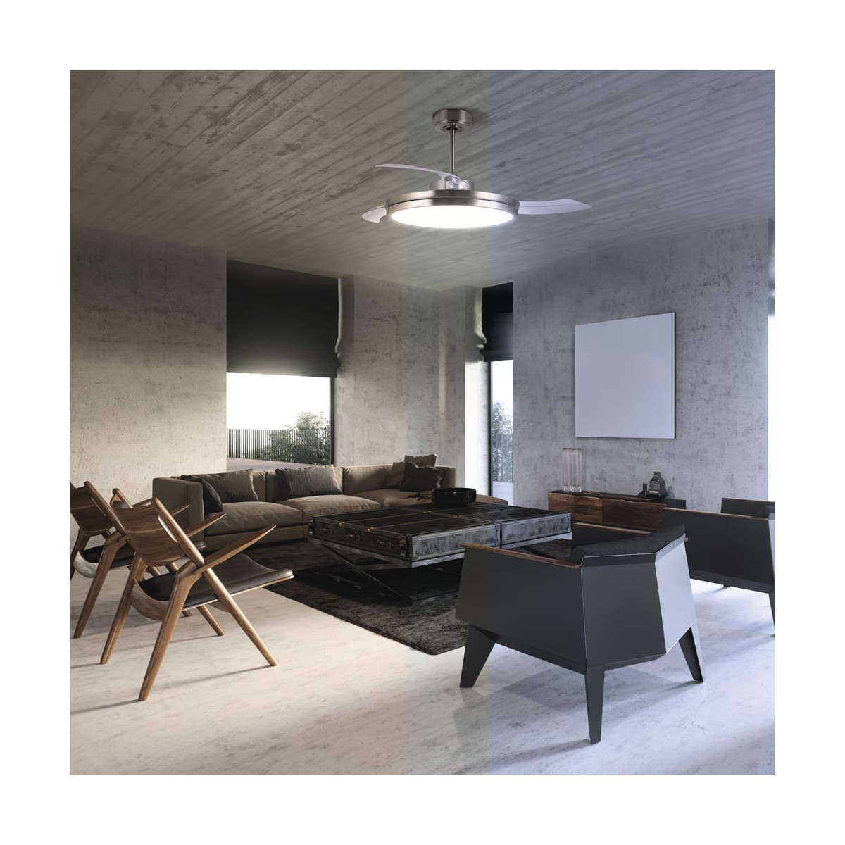 Areca ceiling fan with transparent folding blades and DC motor. Thanks to its motor it allows to reduce the consumption achieving up to 6 speeds generating very little noise. This fan has integrated 48W LED lighting with three light tones. It also has a breeze function, which changes from one speed to another automatically, creating an atmosphere with natural air. The fan function of this fan makes the fan run for 15 minutes every hour at a medium speed to renew the air.