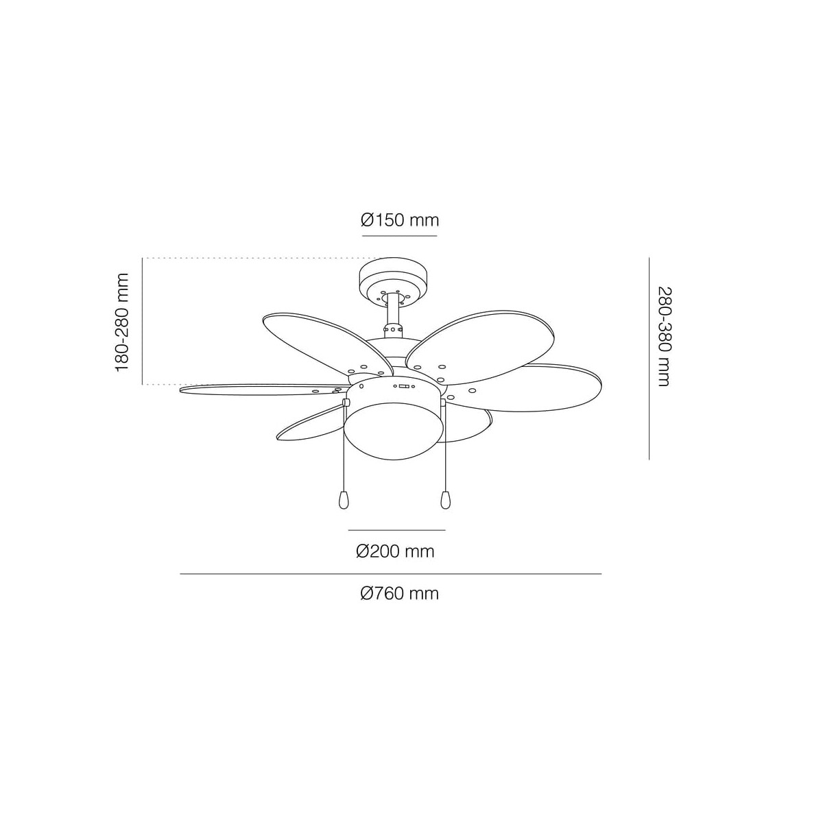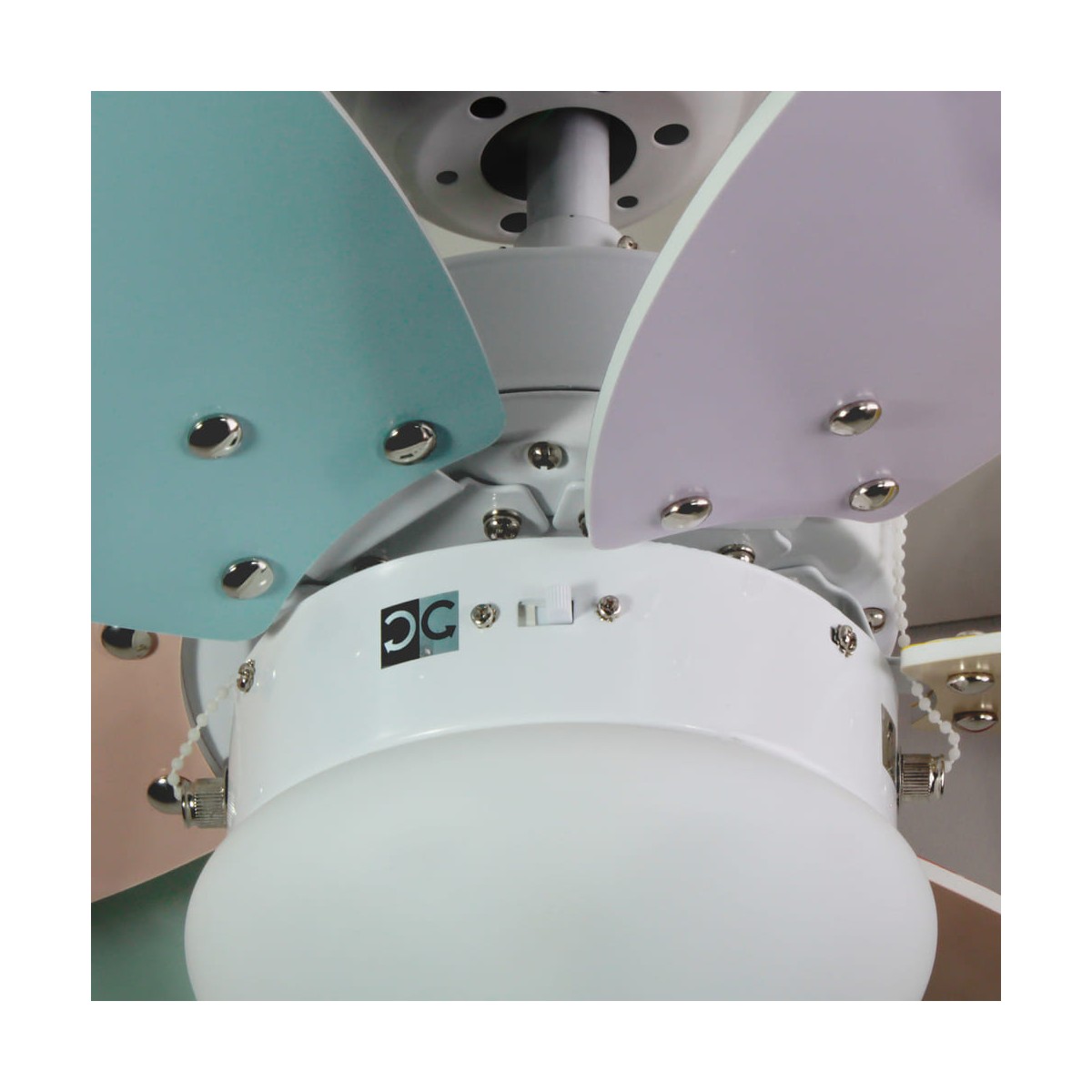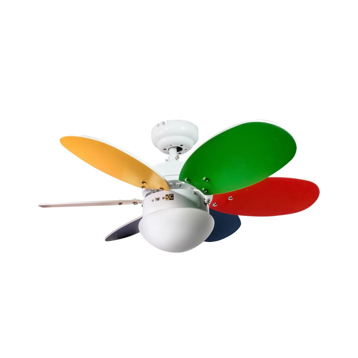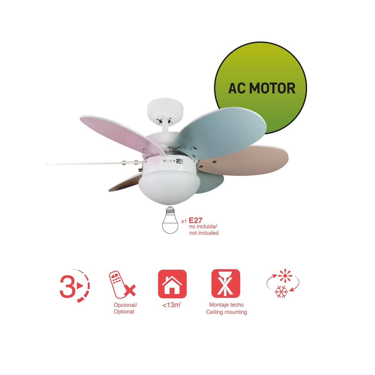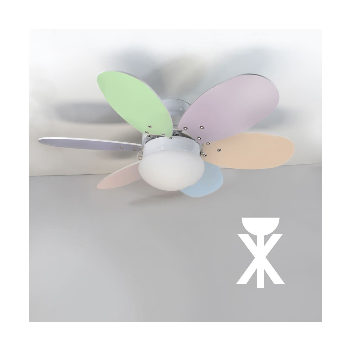 Orion Collection Ceiling fan with 6 reversible blades, made of plywood, in 6 pastel colours or multicoloured to choose from. Economic ceiling fan that has 3 speeds of airflow, and lighting kit, that works with light bulb E27, not included. Summer - winter operation system will help you to enjoy it in all season. The fan switches-on with two cords suspended. You can also connect it to the wall switch, or purchase separately a remote control with the ref. MD VENTI UNIVERSAL.