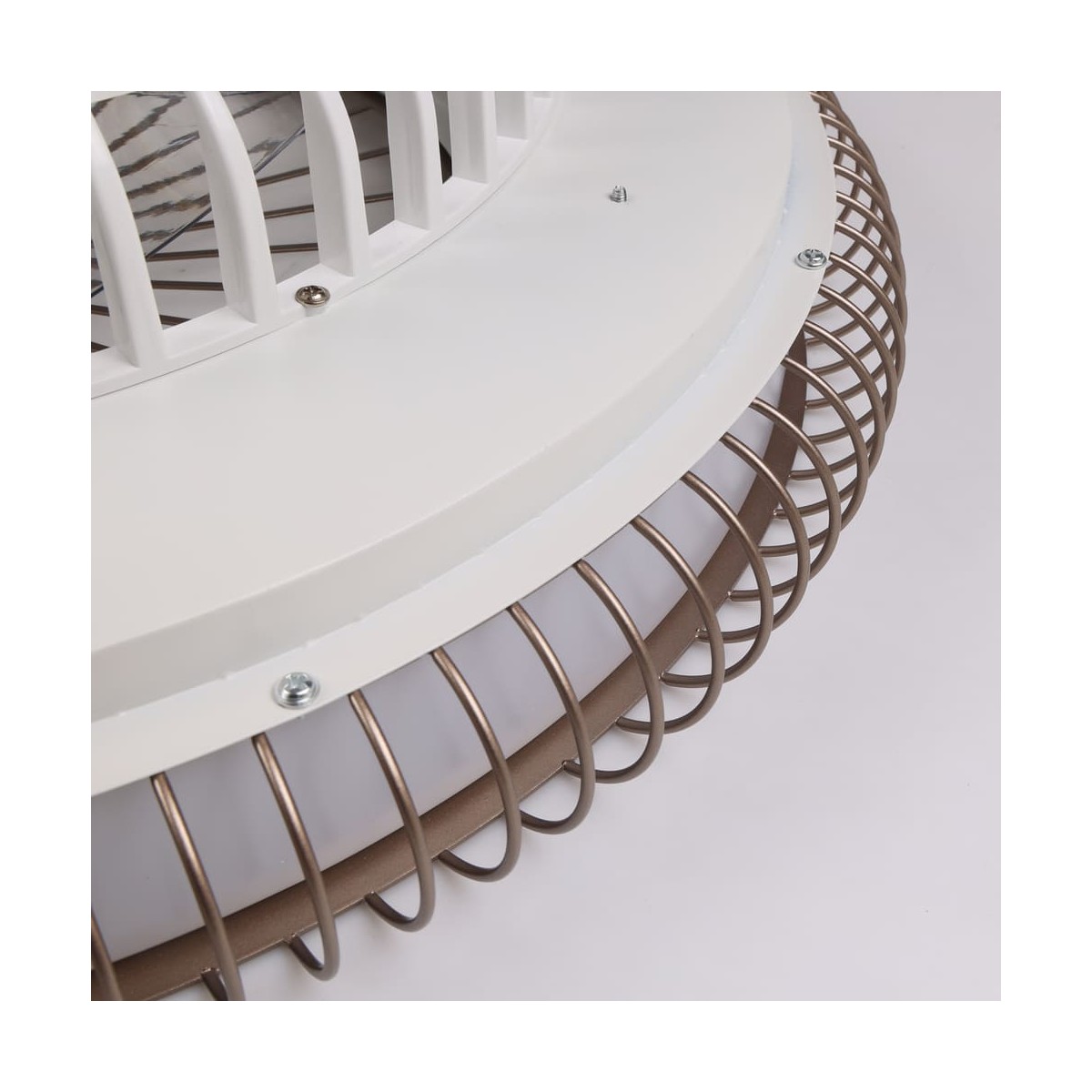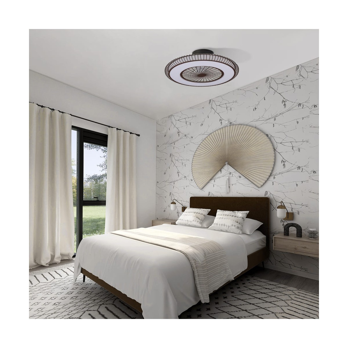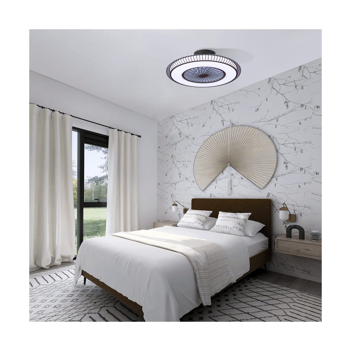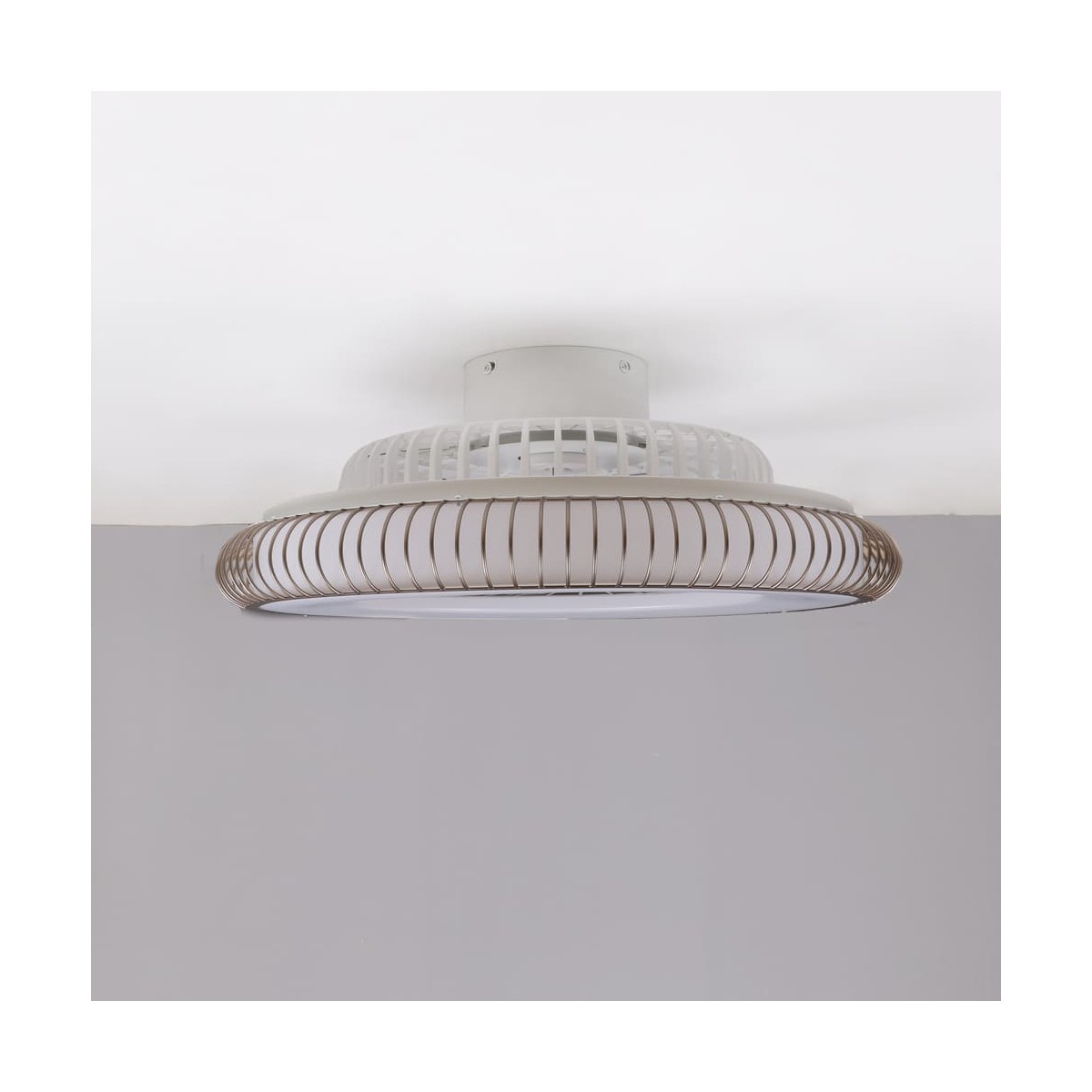 DC fan, without rods, with hidden blades. This fan combines the advantages of fans and ceiling lights. It has a high power (40W) and luminous flux (2800LM), allows temperature control or dimming. In addition, it facilitates the installation with a faster assembly and without screws.