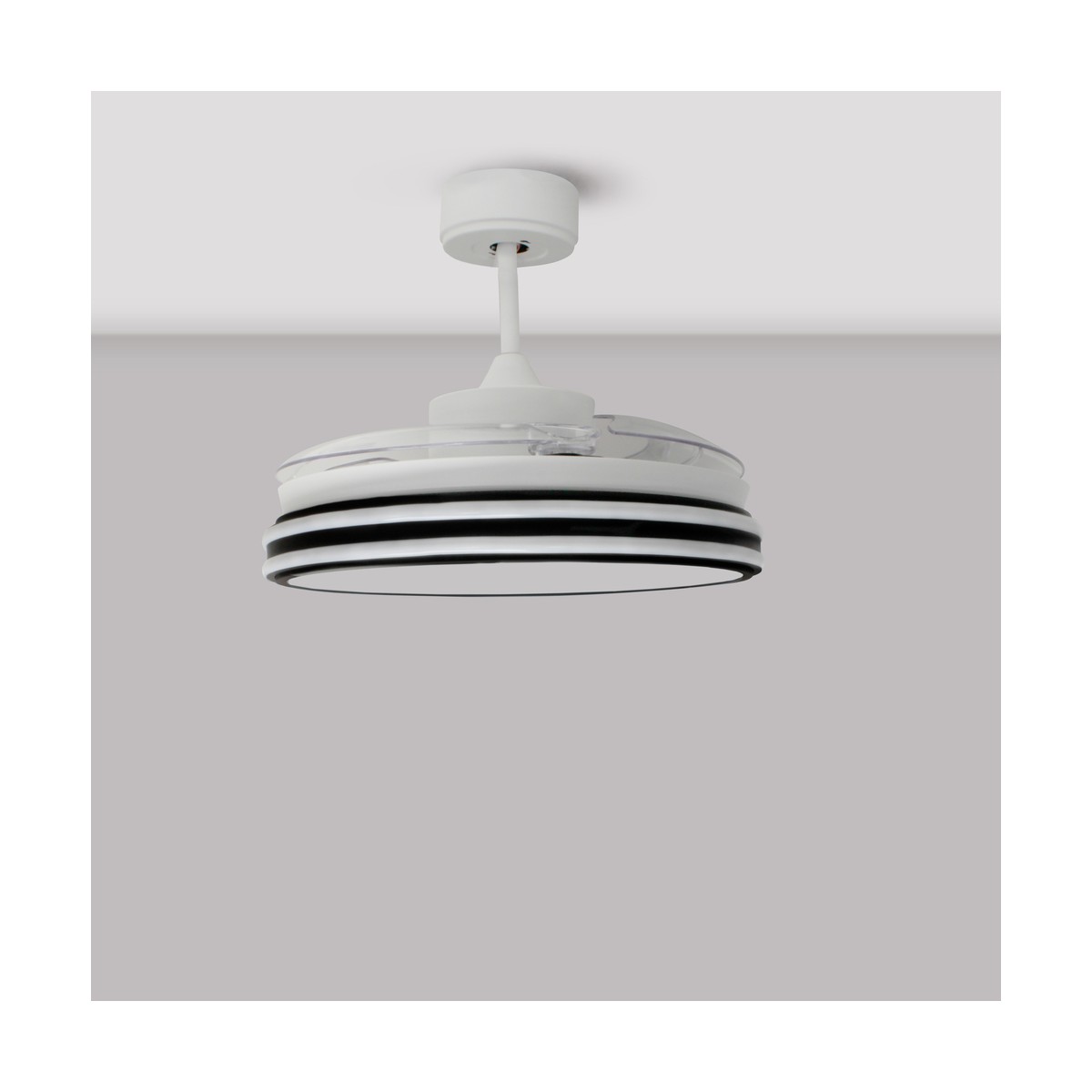 Ceiling fan with transparent folding blades and DC motor. Thanks to its motor it allows to reduce the consumption achieving up to 6 speeds generating very little noise. This fan has integrated 35W LED lighting with three light tones. It also has a breeze function, which changes from one speed to another automatically, creating an atmosphere with natural air.