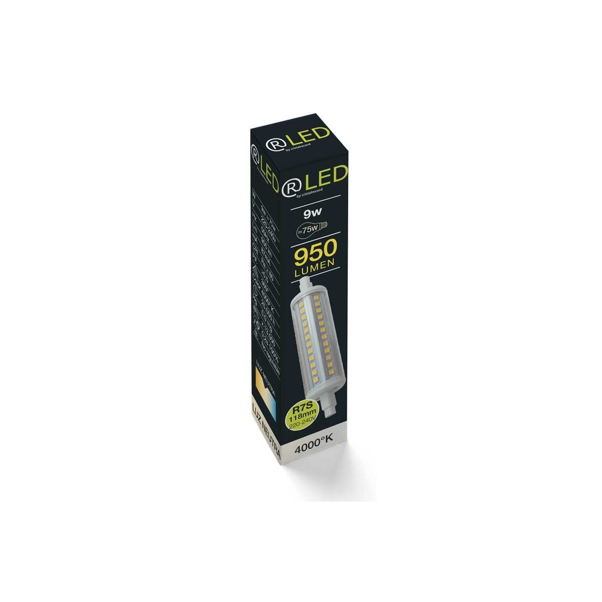 High brightness R7s LED bulb designed to produce 950 lumens of neutral light 4000K by using just 9 watts. Equivalent to 75 watts they will provide a very bright light by only using a fraction of the energy, and they will last up to 25.000 hours.