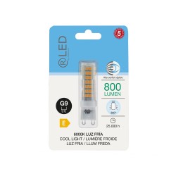 G9 LED bulb with colour temperature 6000K. G9 bulb with 6.5 cm. height and 1.8 cm. diameter. High visual comfort, useful life of 25.000h and 360º light beam. G9 threaded bulb with 6W, 800 lumens and cold white colour temperature (6000K).