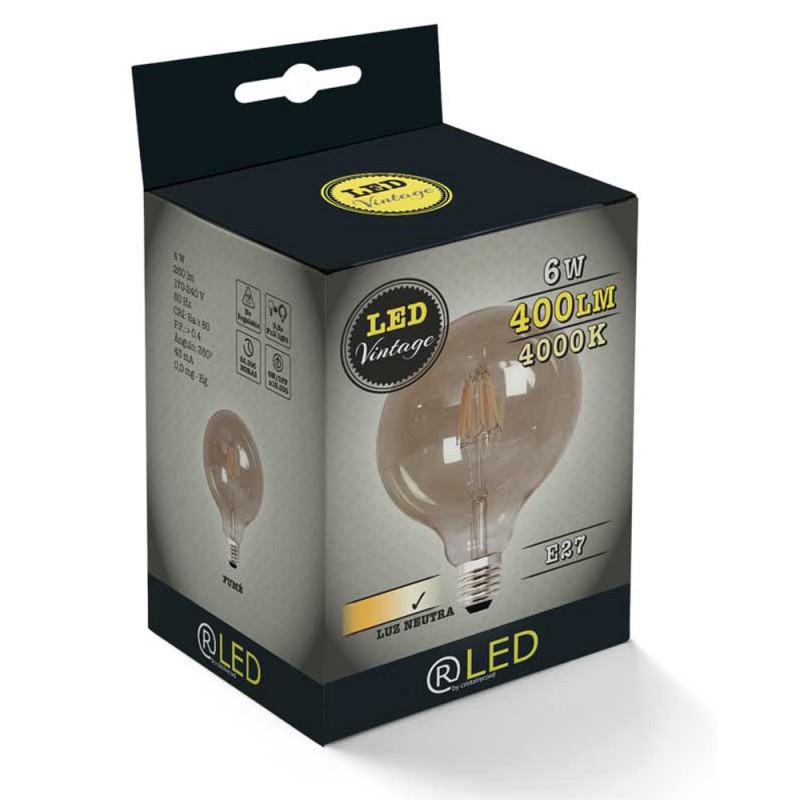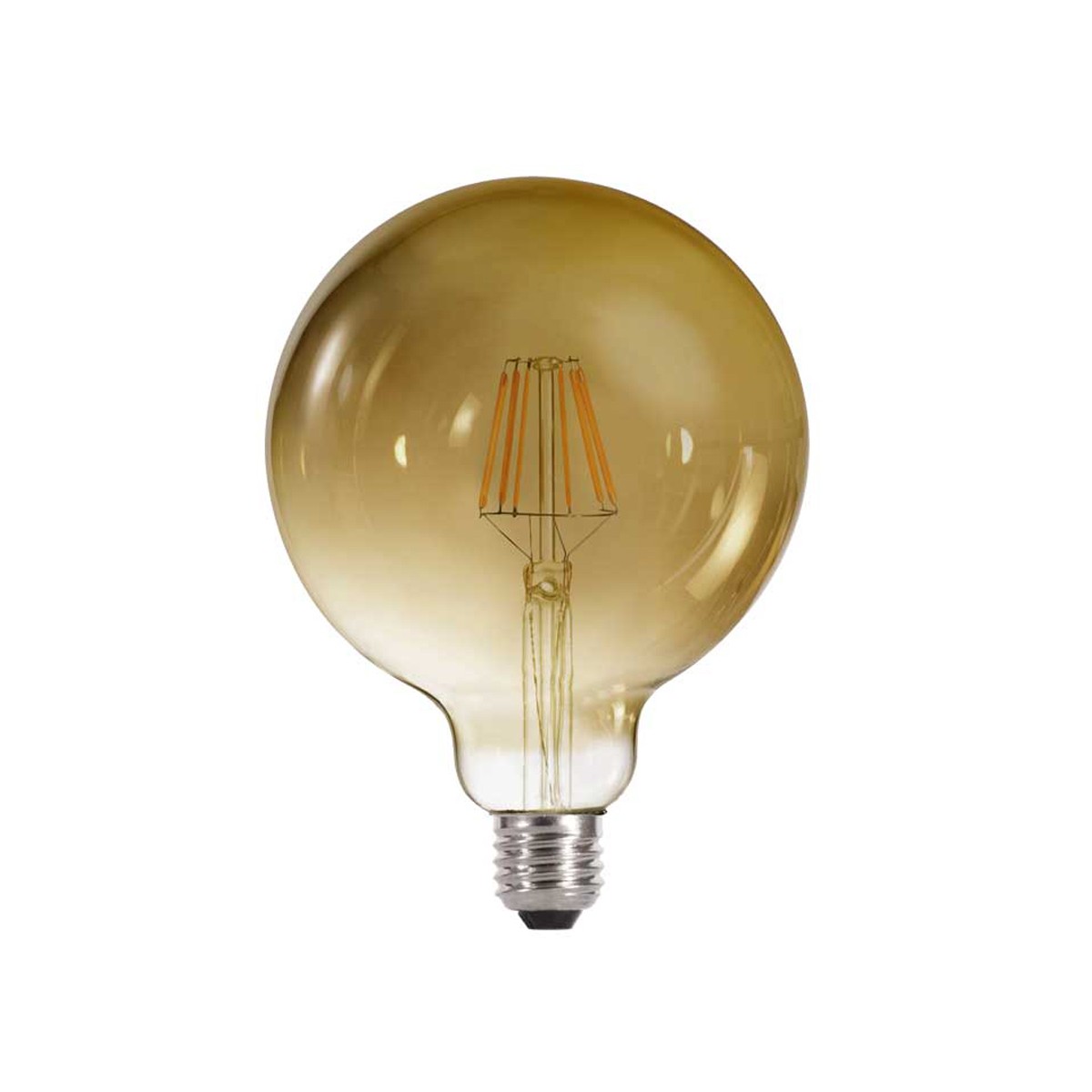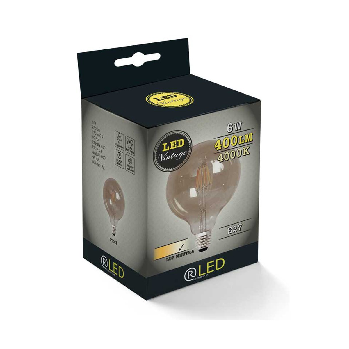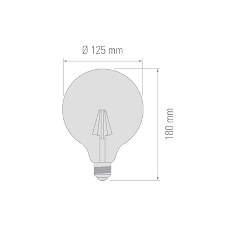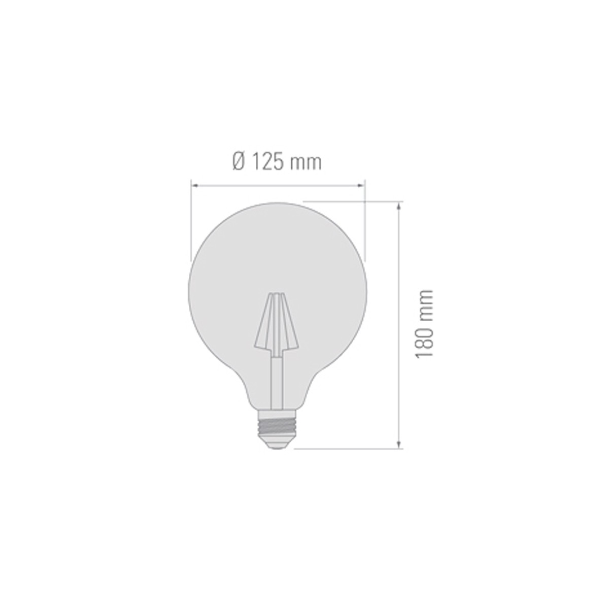 Decorative smoked filament bulb. Bulb thread E27 and globe shape G125 made of smoked glass. LED lighting of 6W, 400 lumens of intensity and neutral white colour tone (4000K).