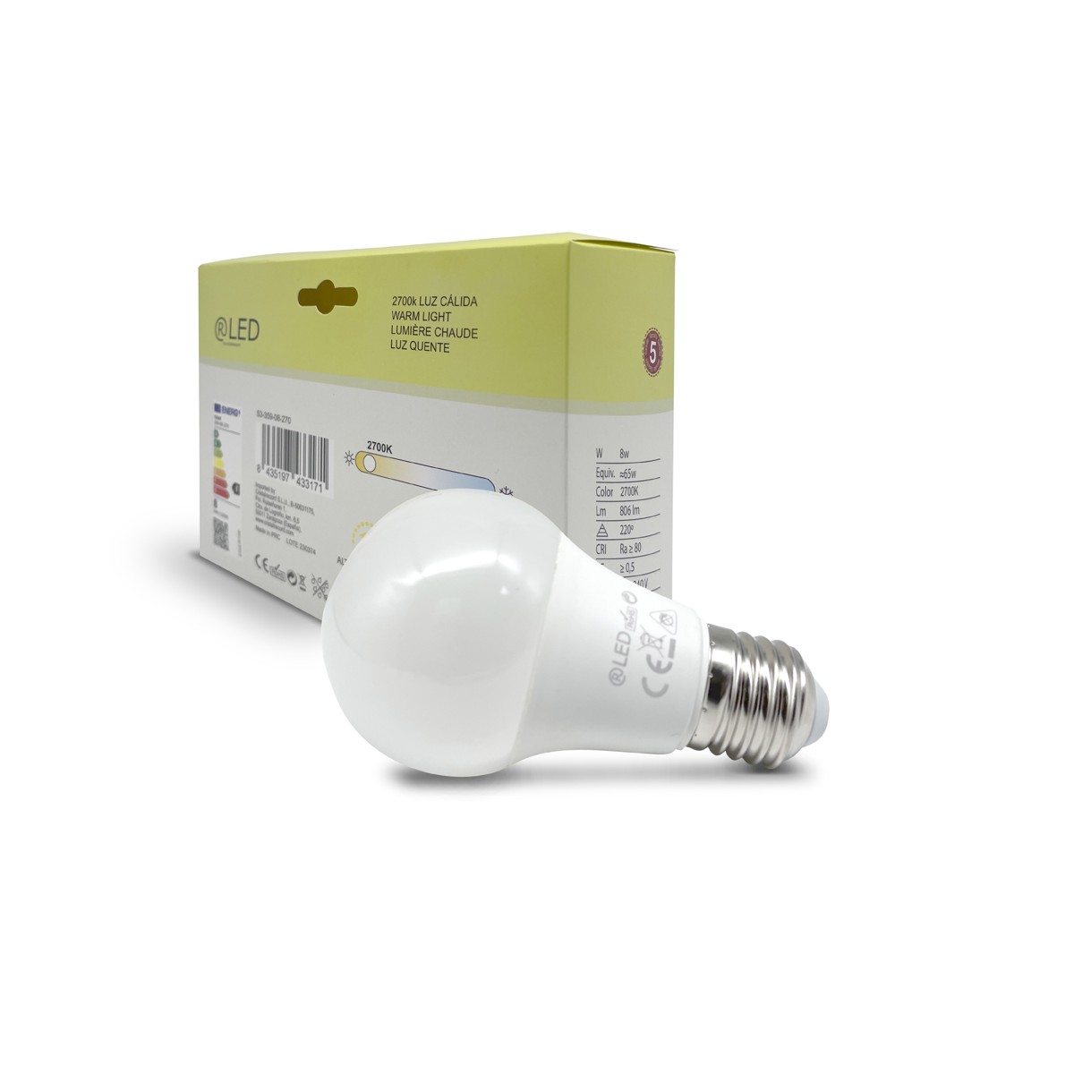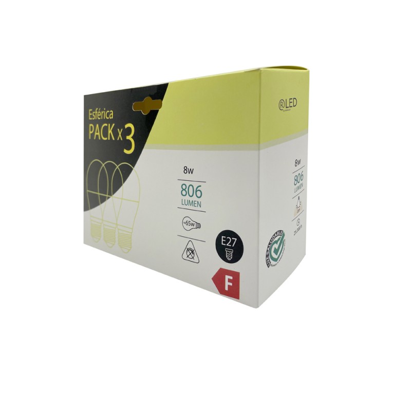 Pack of 3 E27 LED bulbs with 2700K colour temperature. LED illumination of 8W, 806 lumens and warm white colour temperature. 360º light beam. E27 thread and A60 shape. The pack includes 3 bulbs.