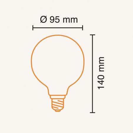 G95 LED bulb in gold finish glass. Ultra efficient class A bulb for indoor lighting. LED 7W, 1435 lumens and colour temperature 3000K. G95 globe bulb with E27 thread, lifespan of 35000 hours and on in 0.5 seconds. Energy efficiency: A. 95mm diameter.