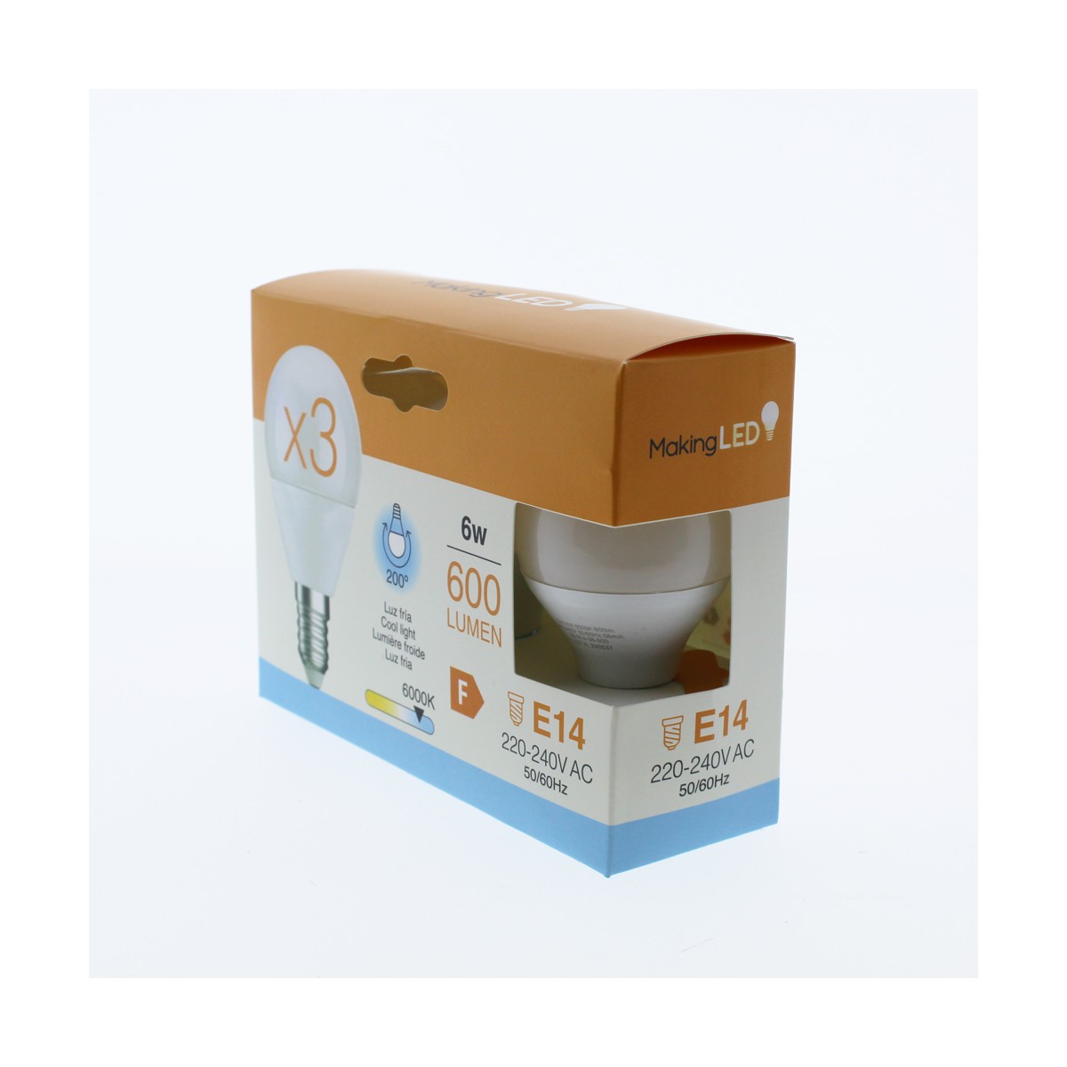 Pack of 3 bulbs E14 G45 thread. LED 6W, 600 lumens and 6000K (cold white light). Light beam of 200º, energy class F and useful life of 35,000 hours. Pack consisting of three E14 LED bulbs.