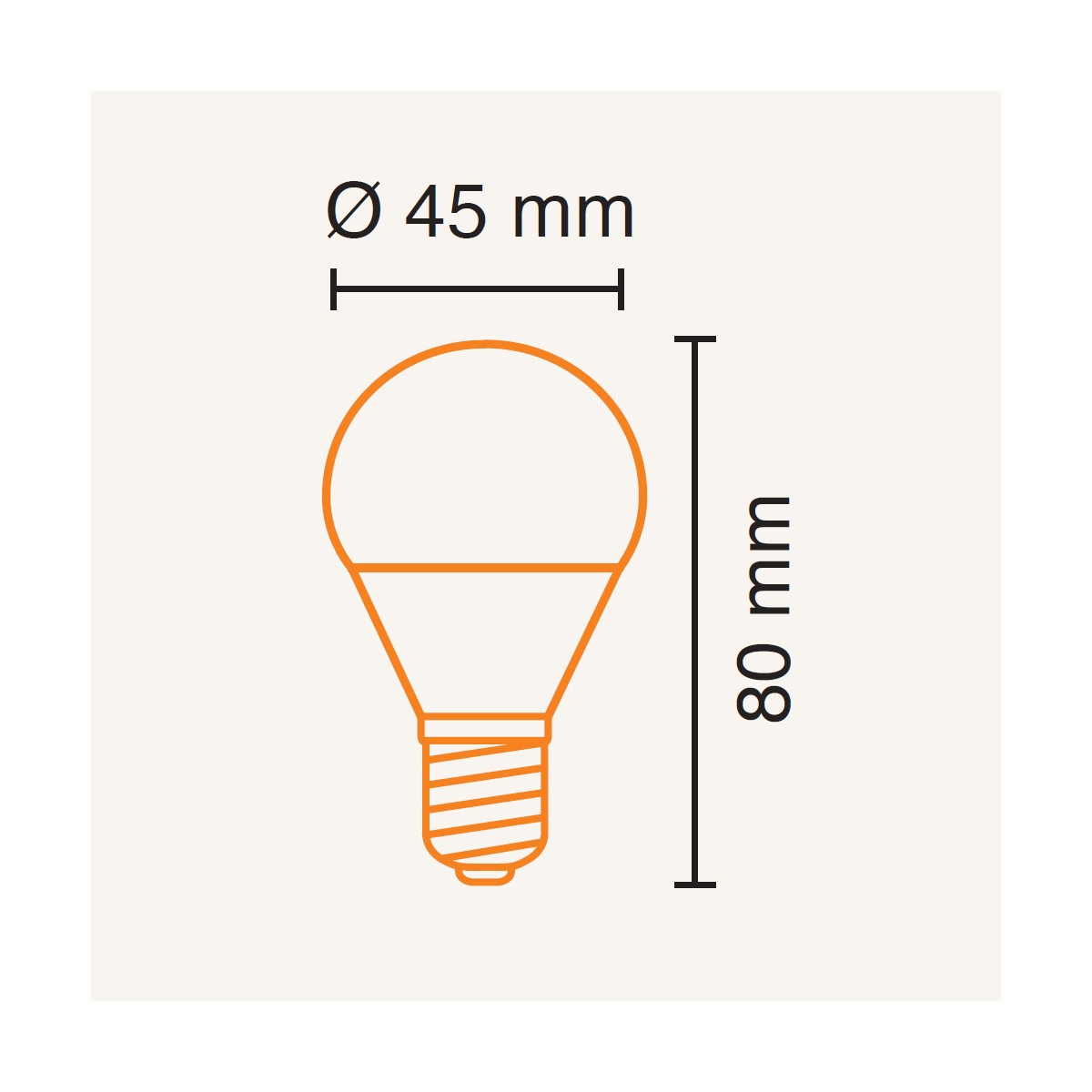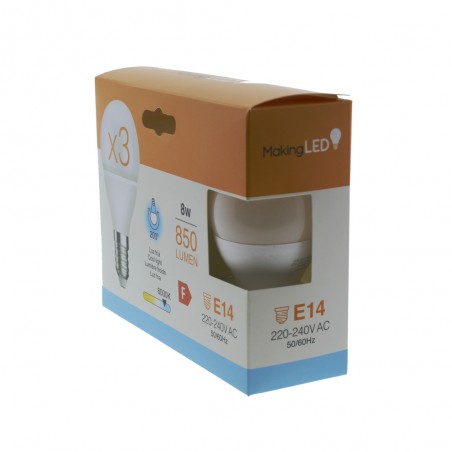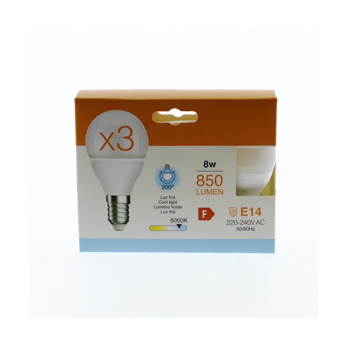 Pack of 3 bulbs E14 G45 thread. LED 8W, 850 lumens and 6000K (cold white light). Light beam of 200º, energy class F and useful life of 35,000 hours. Pack consisting of three E14 LED bulbs.