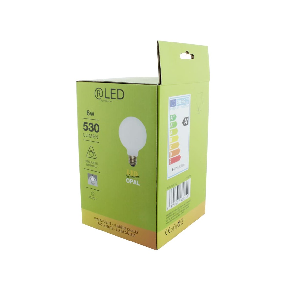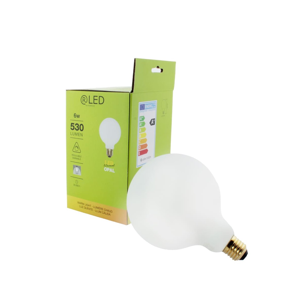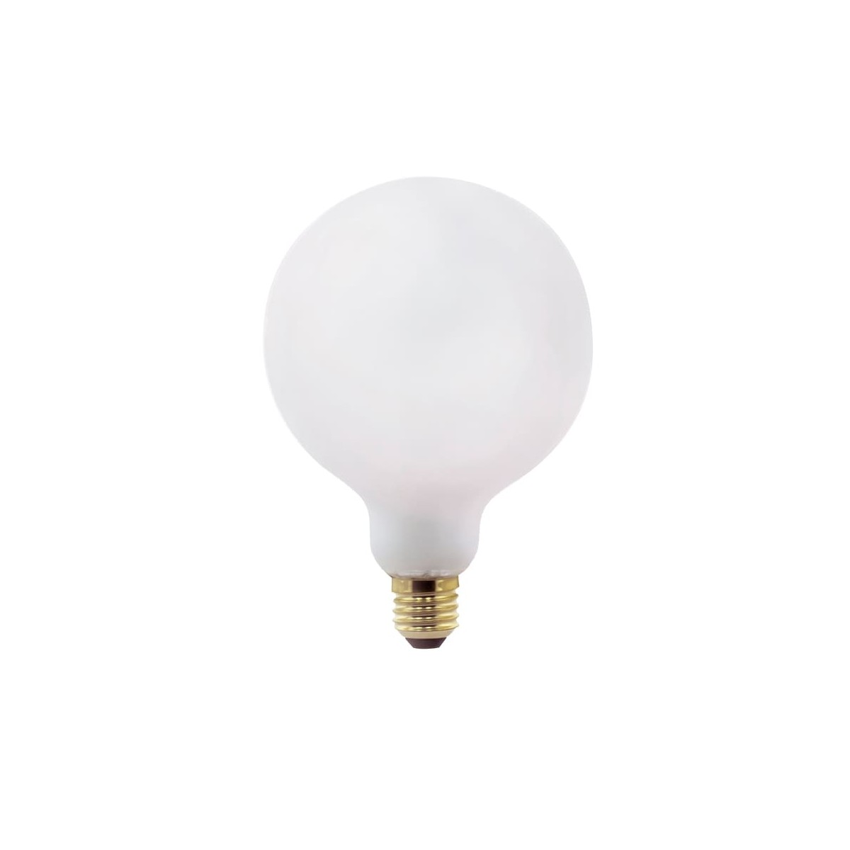 Dimmable Decorative Light Bulb G125 in white matt finish. LED lighting of 6W with 530 lumens in warm temperature of 2700K. This globe shape white light bulb is a great solution for ceiling lights, wall lights, table lamps or floor lamps that has an open lampshade. This bulb has a great decorative effect.