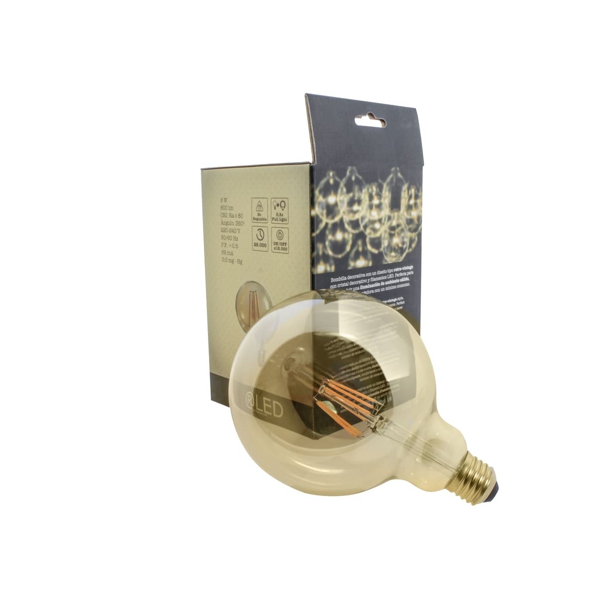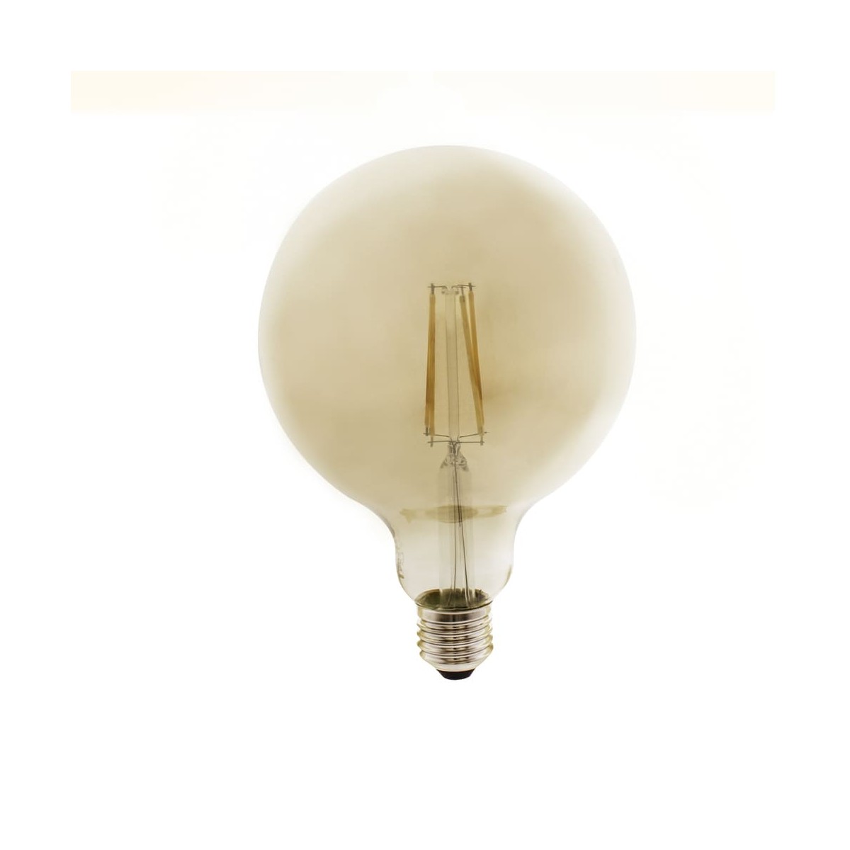 Decorative LED Bulb with Filament made of gold glass. It has a pleasant warm yellow light of 2700K, with 8W power and a luminous efficiency of 100lm/W. This Globe shape 125 cm diameter bulb provides a warm, soft lighting designed to decorate industrial, vintage o rustic interiors.
