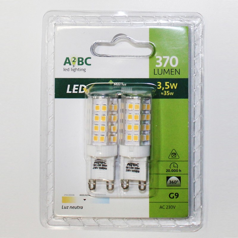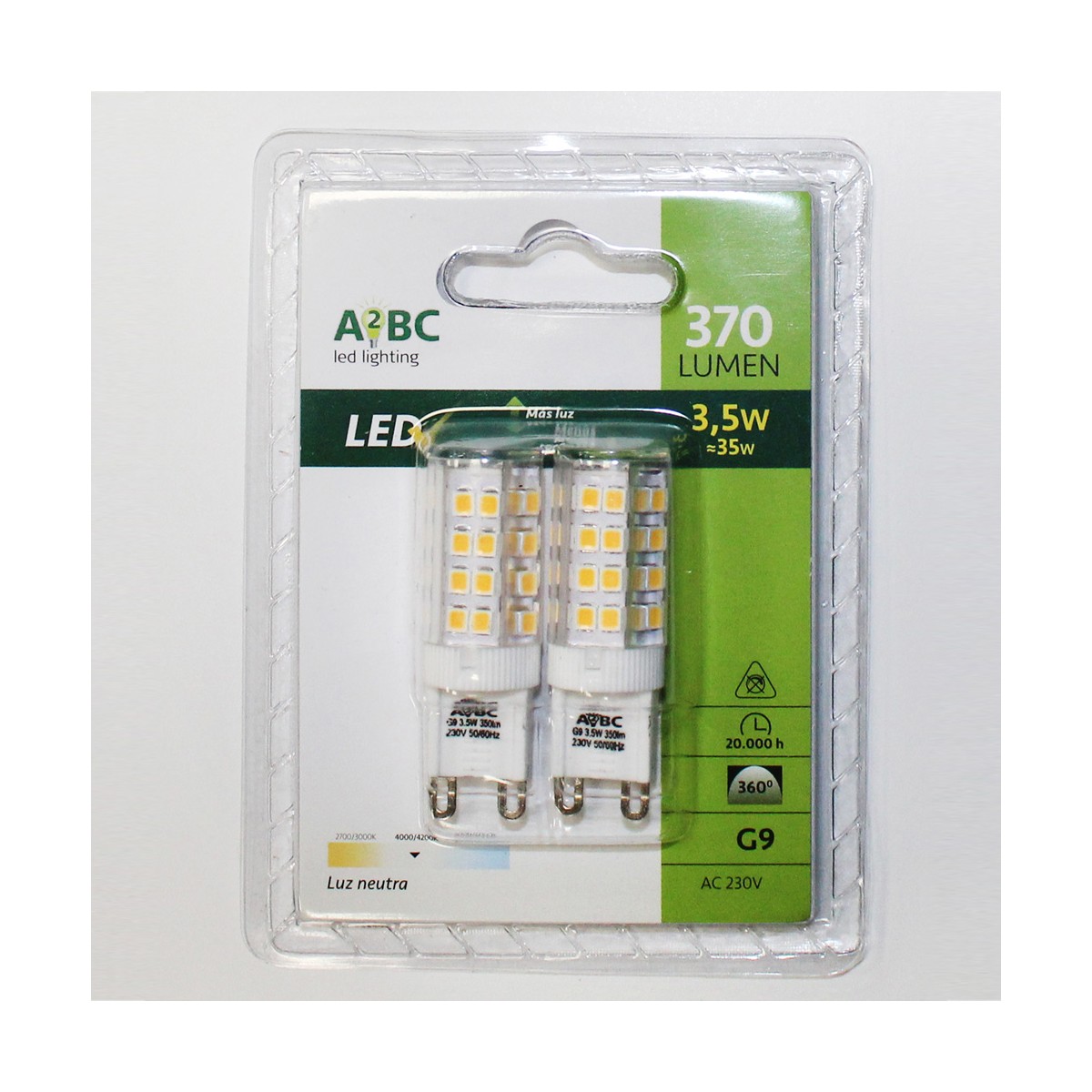 Pack of 2 LED G9 bulbs 3.5W. G9 bulbs with 3.5W, 370 lumens and neutral white colour temperature 4000K. The blister pack includes two special G9 bulbs to fit in tubular lamps or small lampshades.