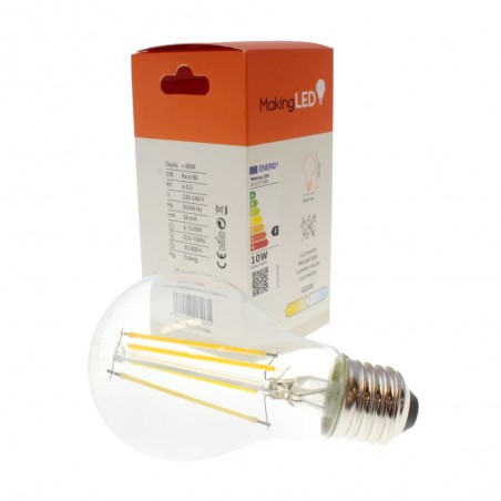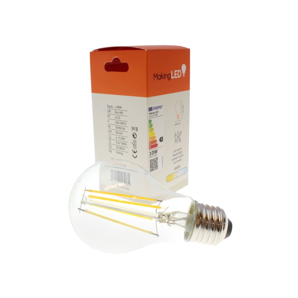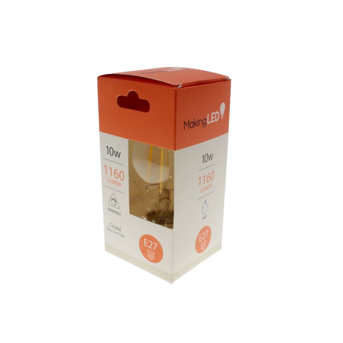 Transparent glass bulb with 10W dimmable filament LED with a luminous flux of 1160lm. Natural white light.