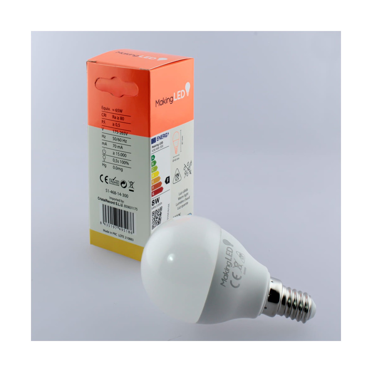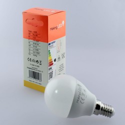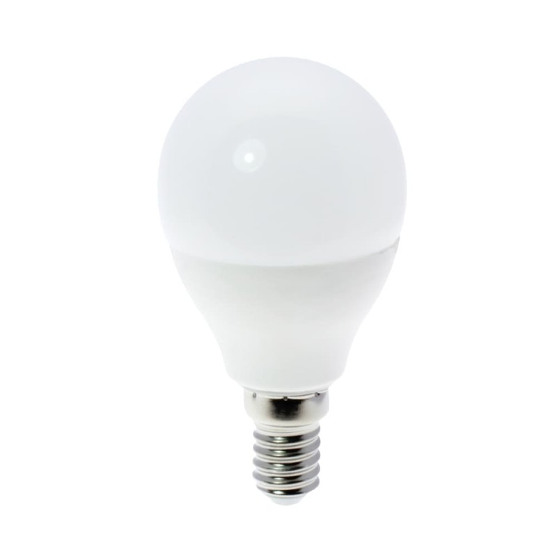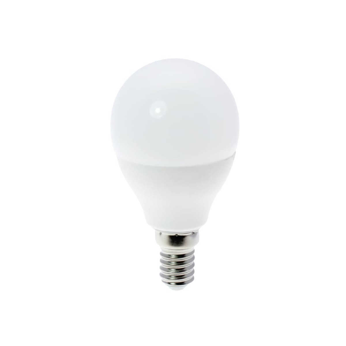 Light bulb with E14 base, 45mm spherical, made of PVC with matt white diffuser.
