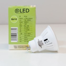 8.2W LED bulb with GU10 base with three temperatures. You can select the temperature at which you want to turn it on thanks to its switch before installation.