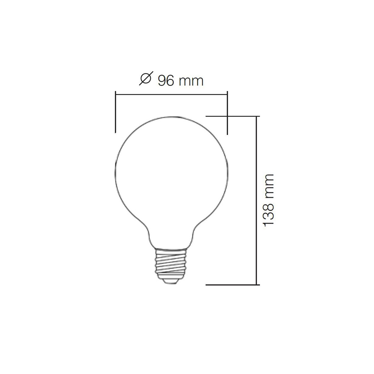 Globe bulb of 95 mm diameter, made of glass with spiral COB LED filament. Decorative challenge style bulb, for ceiling lamps, wall lights, table lamps and floor lamps.