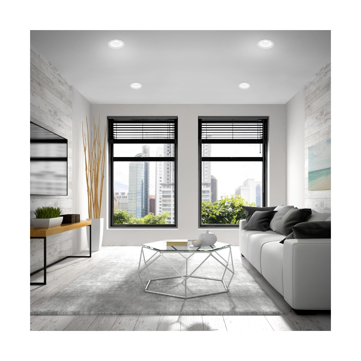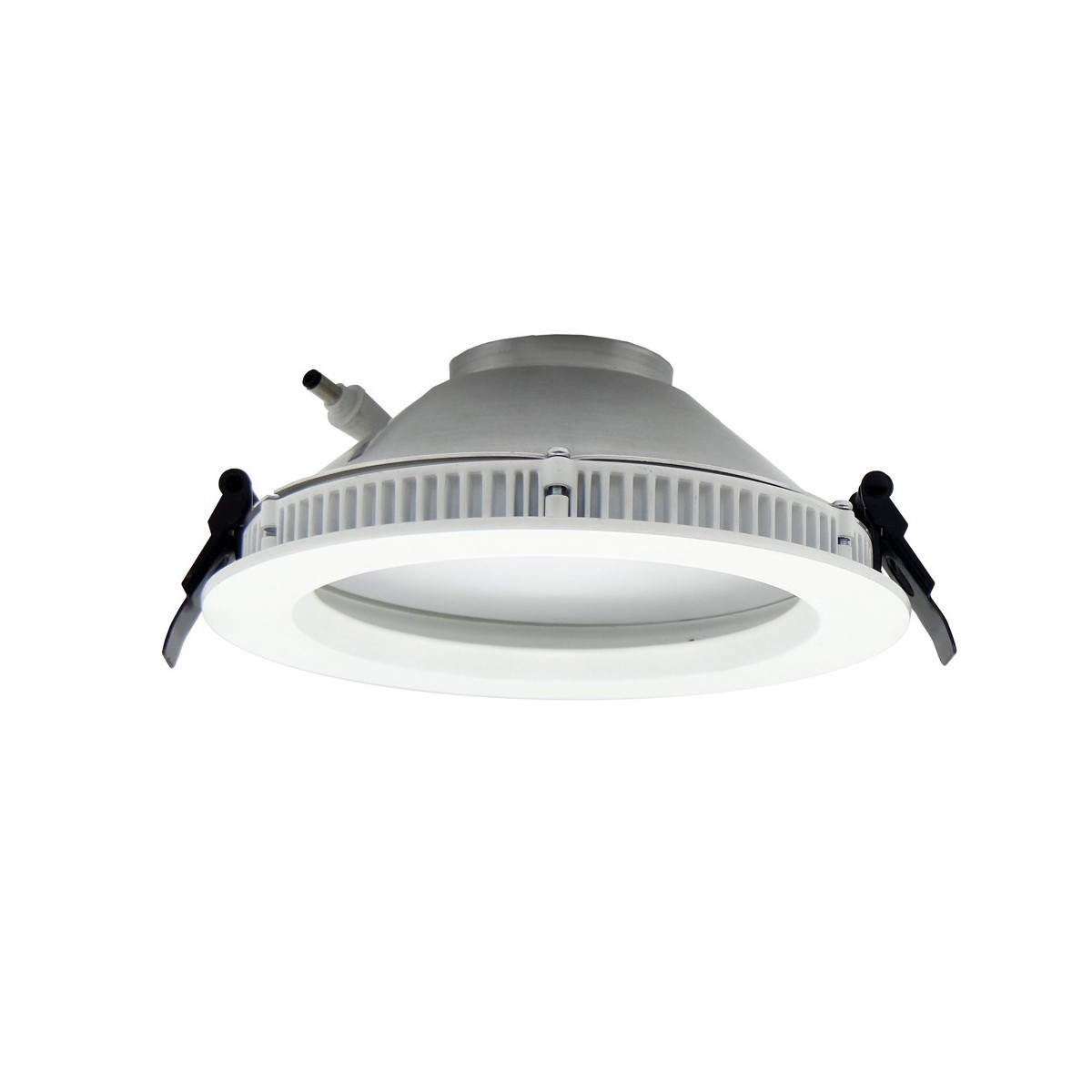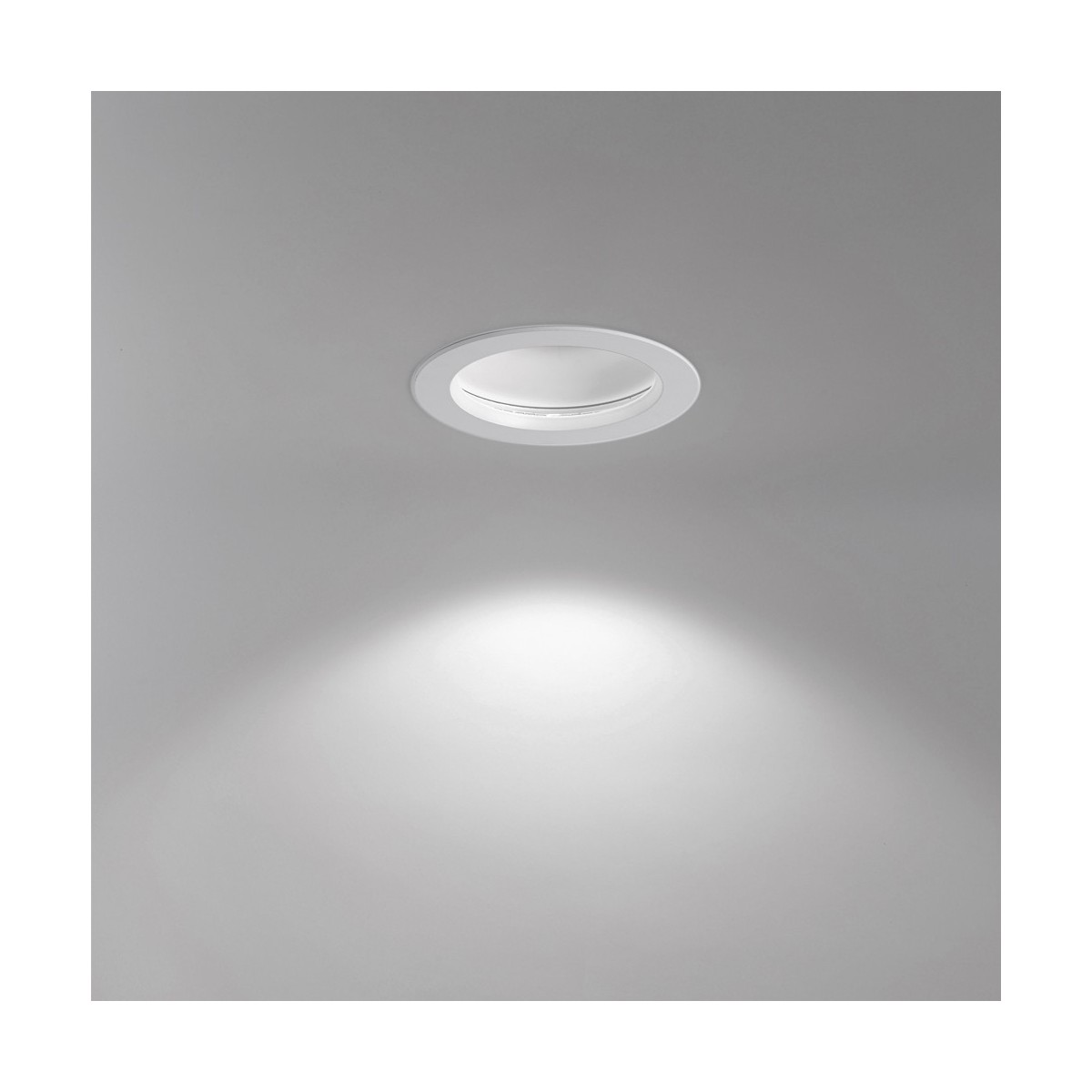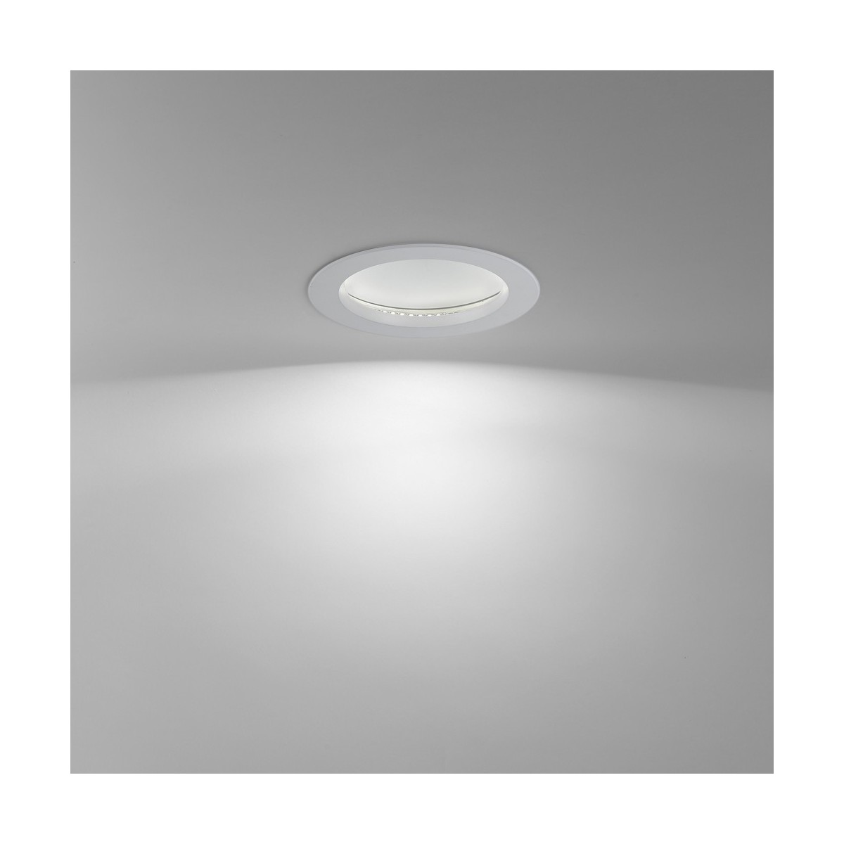 Round LED Recessed Light Novo Opal made of aluminium in a white finish. It offers combined lighting, which means you have three lights in one, ambient light provided by the LED strip, 12W 900lm 4000K and reflected on the bezel to cover a larger area, direct light from the LED bulb, GU10 not included, and a combined lighting result of mixing both. *Bulb not included.