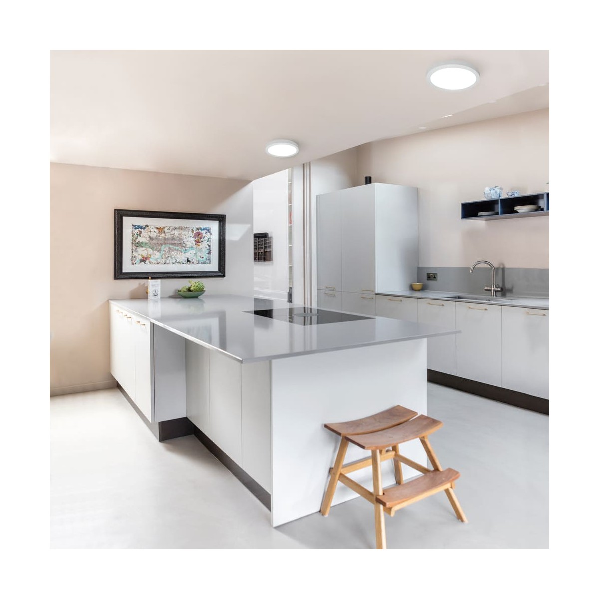 Round LED Downlight with integrated 18W LED lighting, with 1440 lumens. Neutral light 4000K. White lacquered aluminium structure with acrylic diffuser.