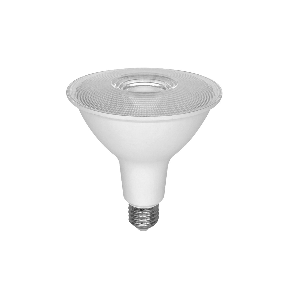 E27 PAR38 LED bulb with green light. E27 threaded bulb, diameter 122 mm. and 38º light beam. 16W LED illumination, 1400 lumens and green light.
