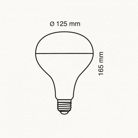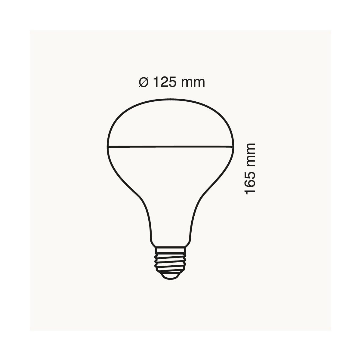 250W infrared bulb. Designed to provide constant and controlled temperature in specific environments. It emits thermal radiation in the infrared range. E27 thread, 125 mm diameter and 38º light beam. Infrared light bulb for specific uses such as physiotherapy, drying paint or heating reptiles and small birds.