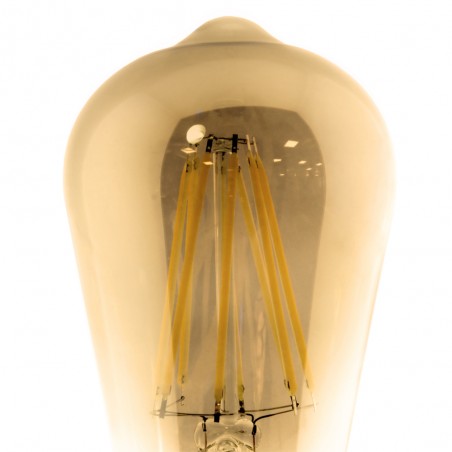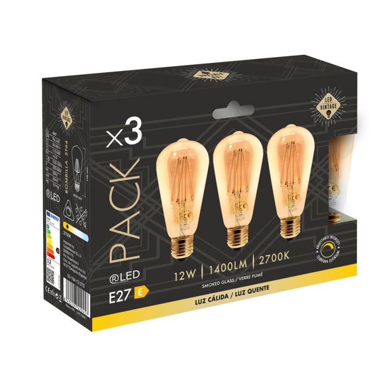Pack of 3 vintage filament bulbs. E27 thread and ST64 shape, with exposed filaments and gold finish glass. It has 12W LED light, 1400 lumens and warm tone (2700K). They can dim the light intensity. Vintage filament bulbs.