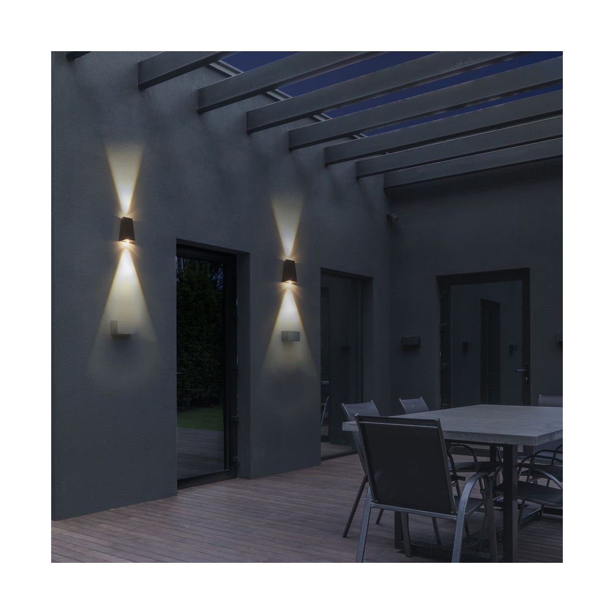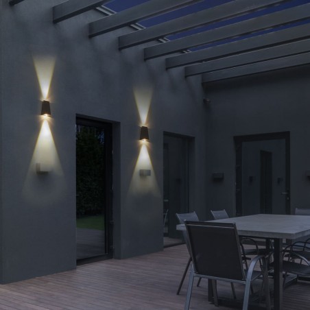 Solar LED wall lamp Nalin for gardens and terraces. Wall light designed to provide a soft ambient light on outdoor walls. Direct light downwards and indirect light upwards illuminating the wall. It can be used without electricity consumption as it has a solar panel to charge the battery during the day. The wall light also has a twilight sensor and power-on memory. Neutral white colour temperature (4000K).