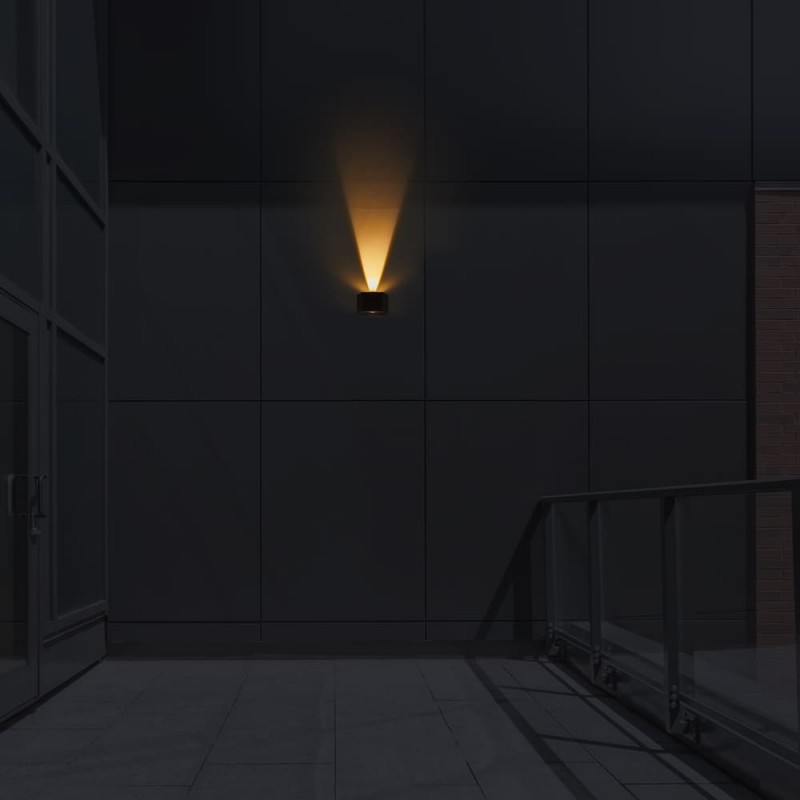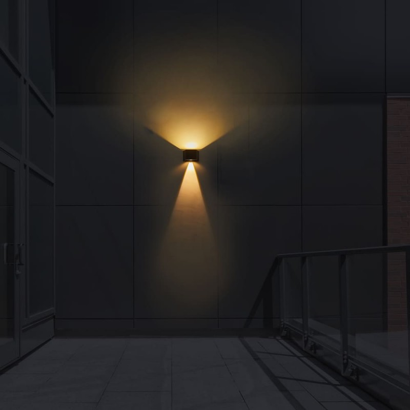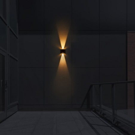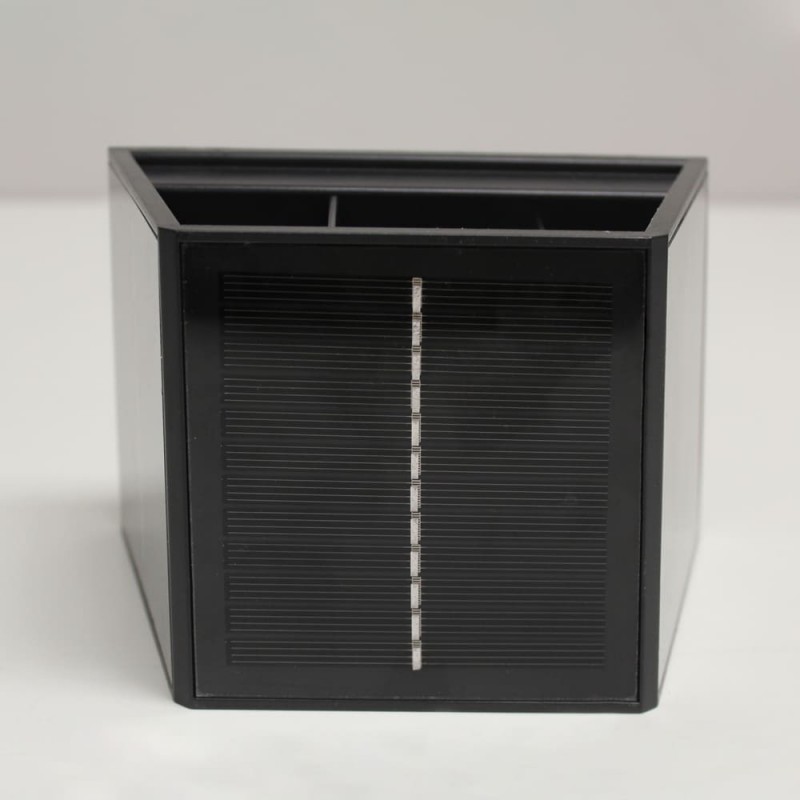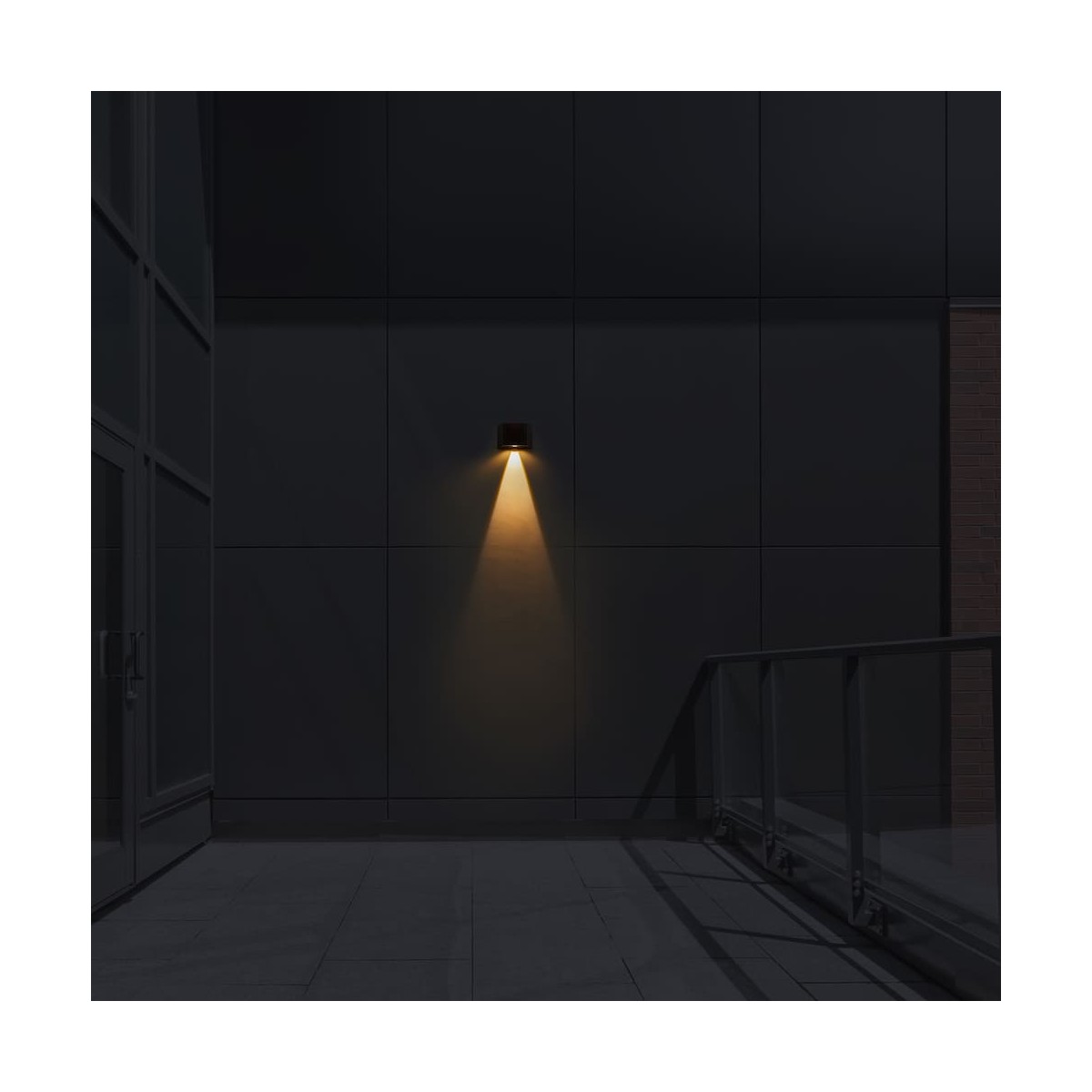 LED wall lamp Vio with top and bottom lighting. Wall light designed to provide a soft ambient light on garden walls, terraces and porches. Its design allows the aperture of each light beam to be adjusted independently. It has a solar panel on the front to charge the wall light with sunlight and to be able to use it without energy consumption. Warm white colour temperature (3000K) and twilight sensor.