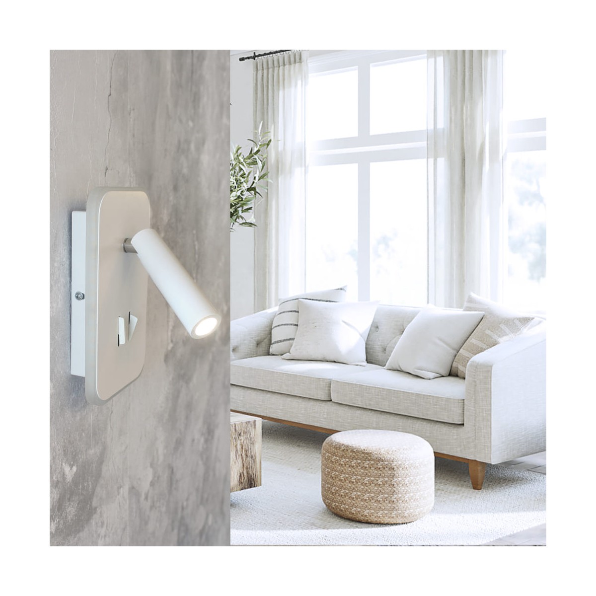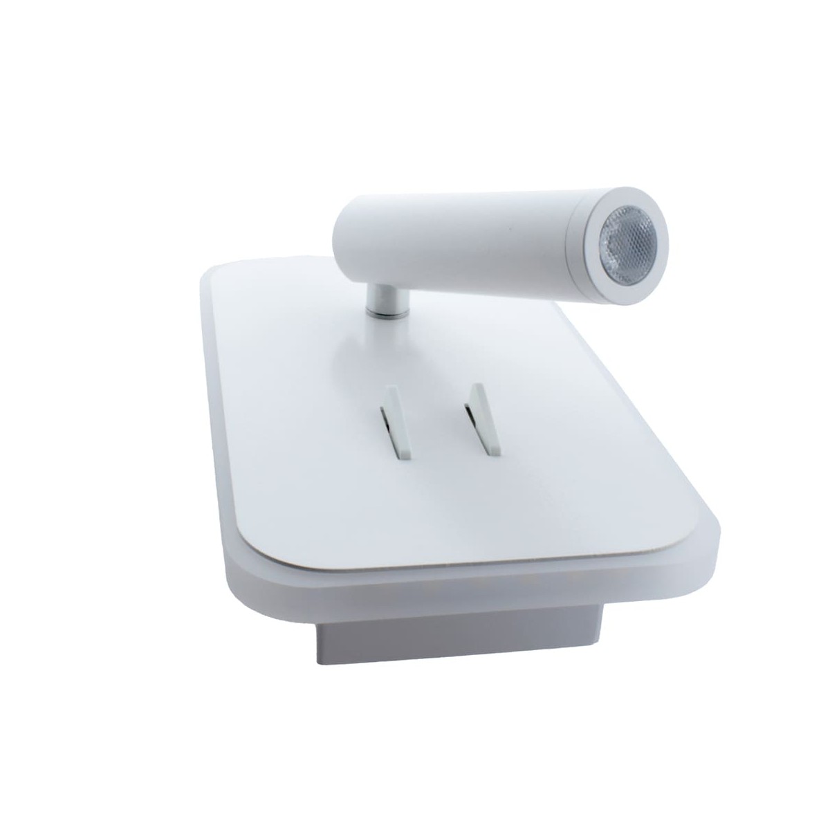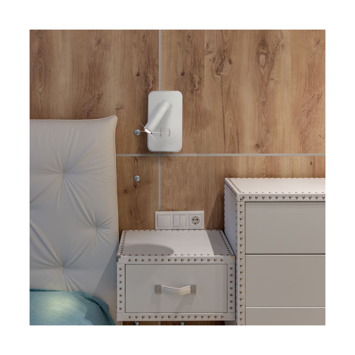 Irena Wall light with double lighting. It has spotlight of 3W in warm temperature that can be directed, and a light frame, also in warm lighting of 11 W, that will provide you an ambient lighting. You can switch in on/off individually or separately. Three different lights in the same wall light. Modern light for bedside lighting. Made of white lacquered aluminium. Also available in black.