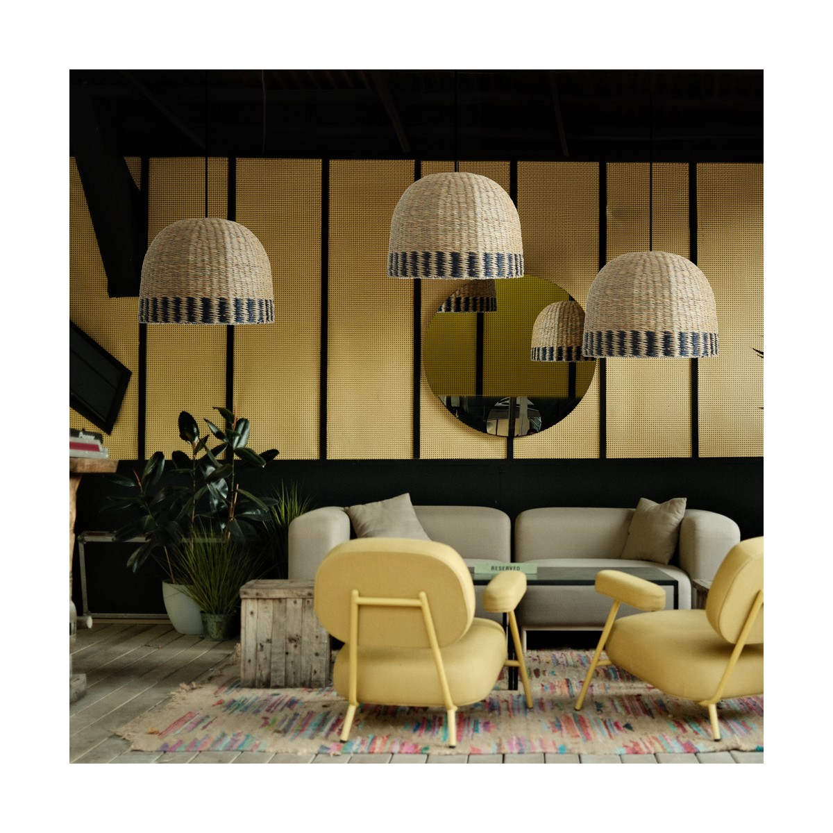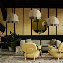 Keyla natural algae lampshade. Dome-shaped lampshade with a diameter of 40 centimetres made of natural seaweed. Fit an E27 ceiling pendant to create a boho-chic pendant lamp for your business. Height 30 centimetres and diameter 40 centimetres.