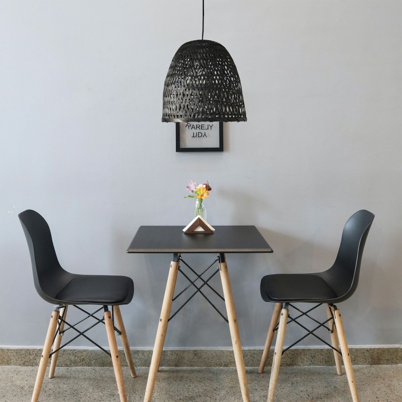 Black bamboo lampshade for ceiling lamp. Dome-shaped design with braided bamboo allowing light to pass slightly into the environment. To be combined with a lamp holder to create a pendant lamp.