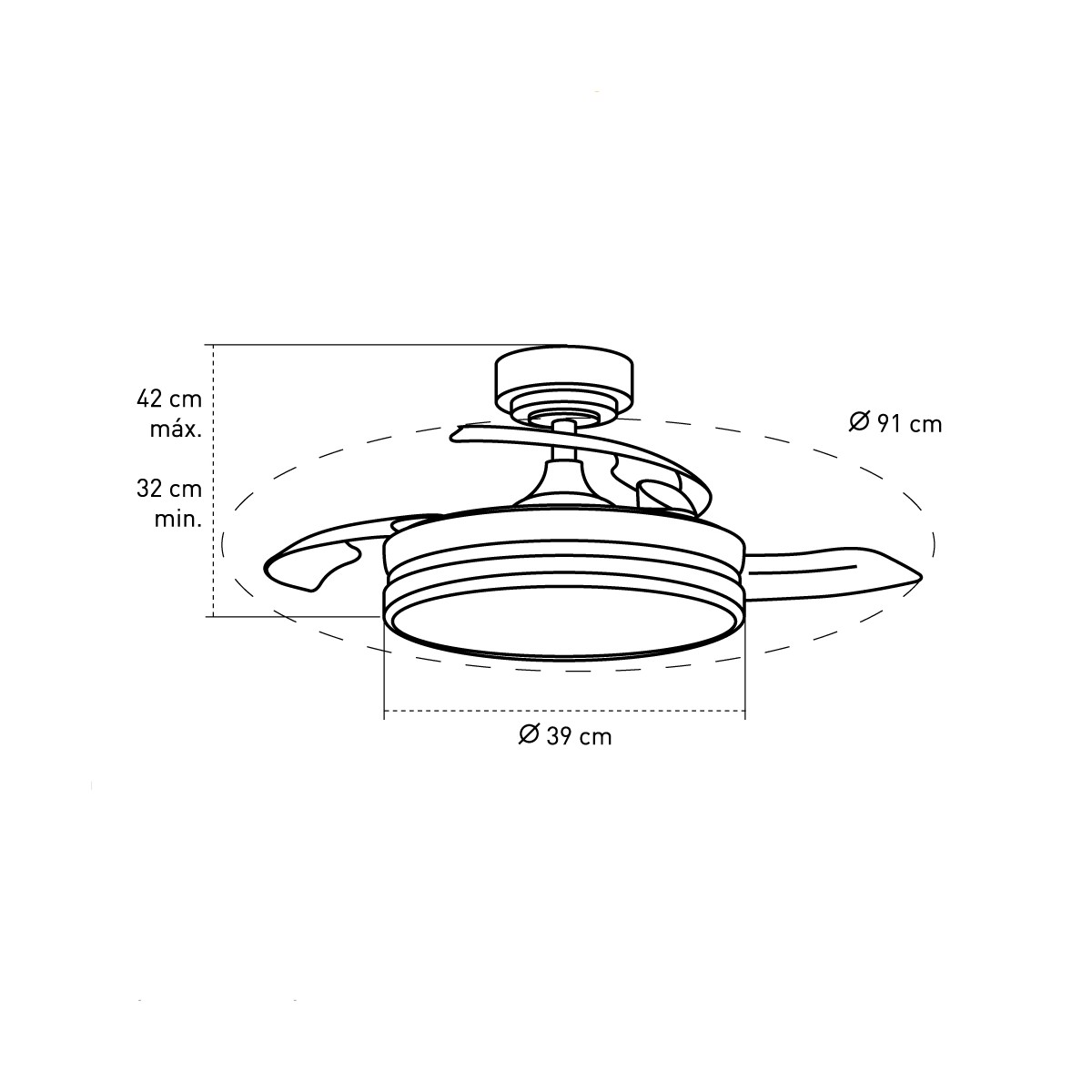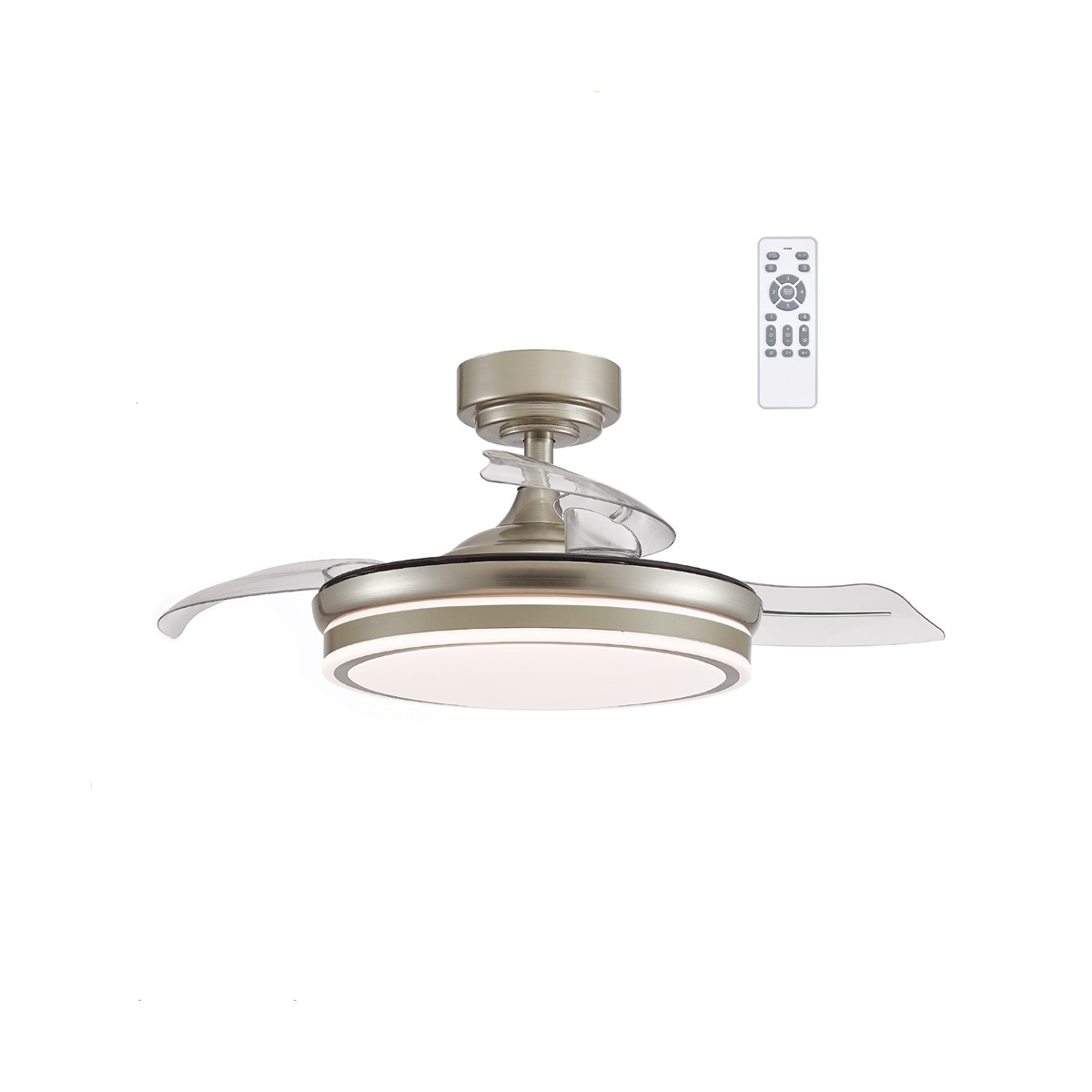 Mini Moss LED ceiling fan for small rooms. Ceiling fan with retractable blades designed to provide airflow and lighting in bedrooms and small living rooms. It has an ultra-quiet motor with 6 rotation speeds, reverse winter-summer function, timer and breeze function. As for the lighting, you can set three lighting tones (warm, neutral or cold) and dim the intensity of lumens. The body of the fan is finished in nickel and the folding blades are transparent.