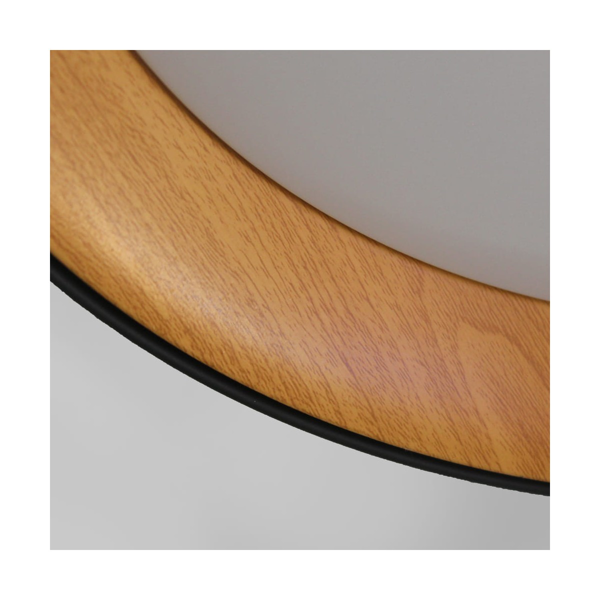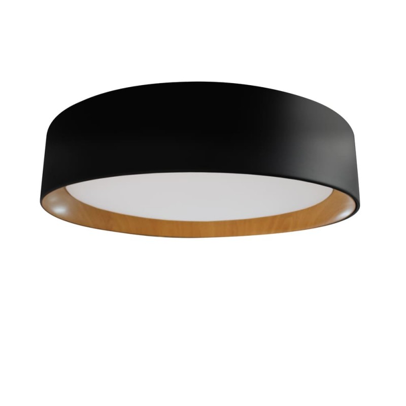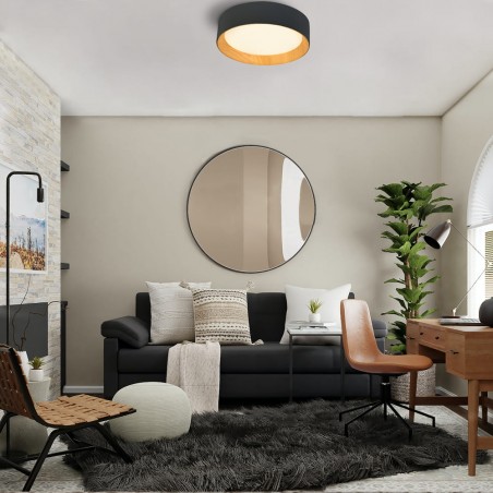 LED ceiling flush light Lea for bedroom and living room lighting. The wood effect decoration on the inside is the main attraction of this Nordic style ceiling light. The ceiling light has a circular shape, made of aluminium with a black exterior. Warm LED lighting of 60W and light intensity of 3020 lumens. This ceiling light is available in white or black.