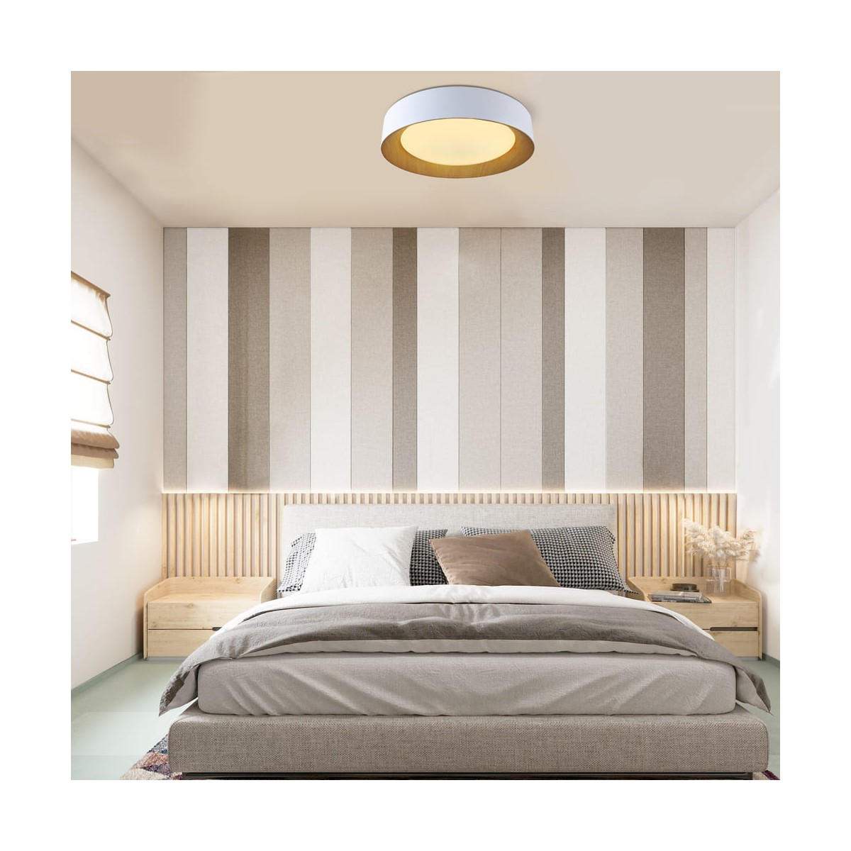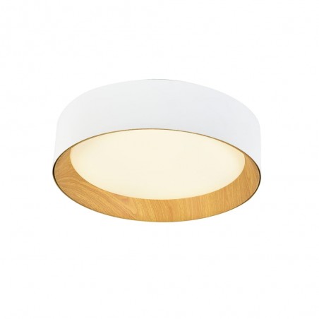 LED ceiling flush light Lili for bedrooms and living rooms. Circular ceiling lamp made of white aluminium with wood-effect decoration on the inside. Its circular diffuser allows to create an optimal lighting in warm tone for the illumination of a room. Nordic style circular ceiling lamp combining white colour with wood imitation.