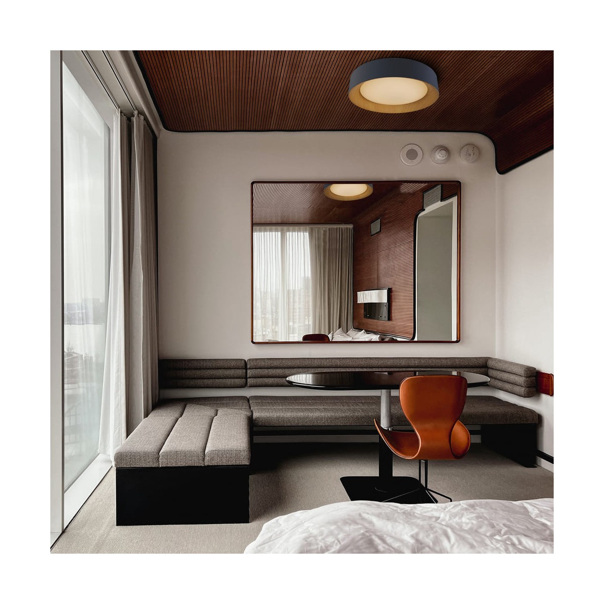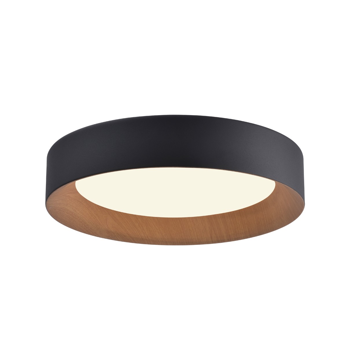 Nordic style ceiling flush light Lili. Ceiling flush lamp made of black aluminium and decorated with imitation wood on the inside. The combination of black and wood creates a Scandinavian style ceiling lamp perfect for a living room or a large bedroom. Circular shaped ceiling lamp with 48W warm light.