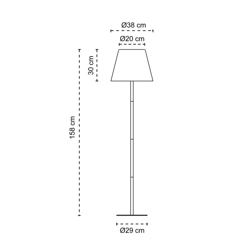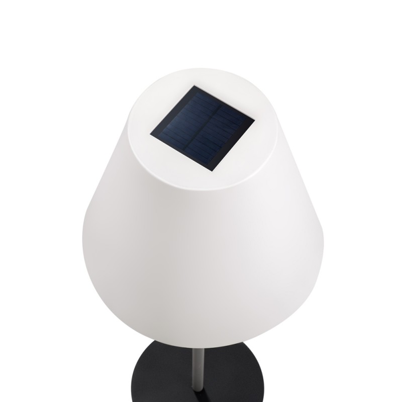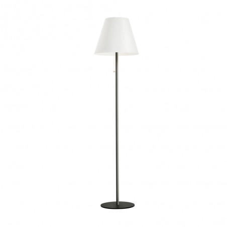 Solar floor lamp for outdoor lighting. Floor lamp with a practical design designed to illuminate a terrace or garden. It has integrated LED lighting in a warm white tone and is switched on and off with a simple rope handle. At the top of the shade is a solar panel that allows the lamp's battery to be charged by sunlight. The battery has a battery life of up to 8 hours (6-8 hours charging time).