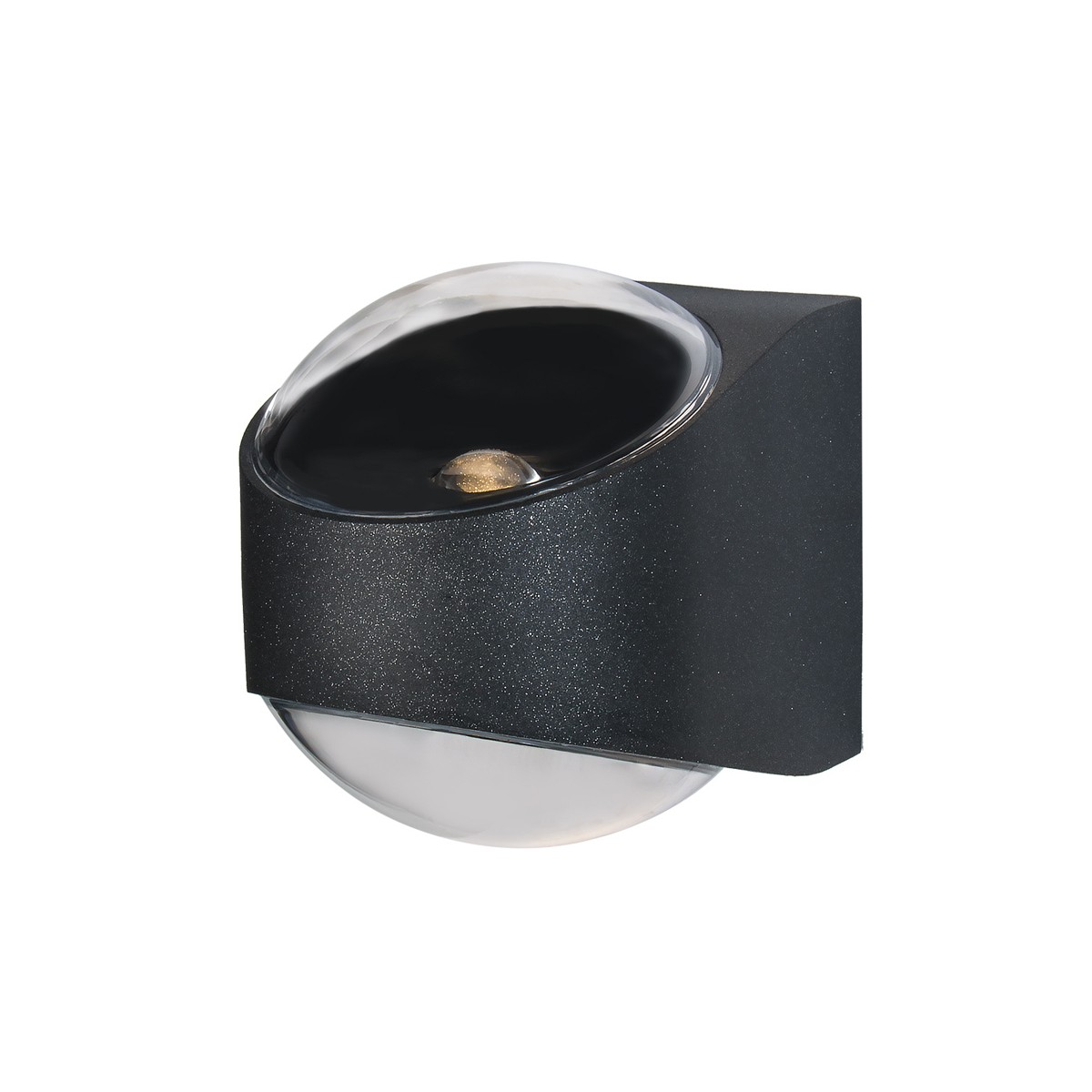 Wall lamp suitable for outdoor lighting. Wall light made from black injected aluminium and two transparent polycarbonate diffusers. It has integrated LED lighting in a warm white tone with a power of 12W. As it is IP54-rated, this wall light is suitable for installing on façades and outdoor walls in gardens, balconies and house entrances.