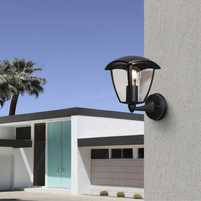 Outdoor wall lamp Durham. Wall light designed for outdoor walls such as porches, gardens and terraces. It has an IP44 rating, manufactured with a black aluminium structure and PMMA diffusers protecting the bulb. The diffusers are transparent which favours the diffusion of light around the wall light. Bulb not included.