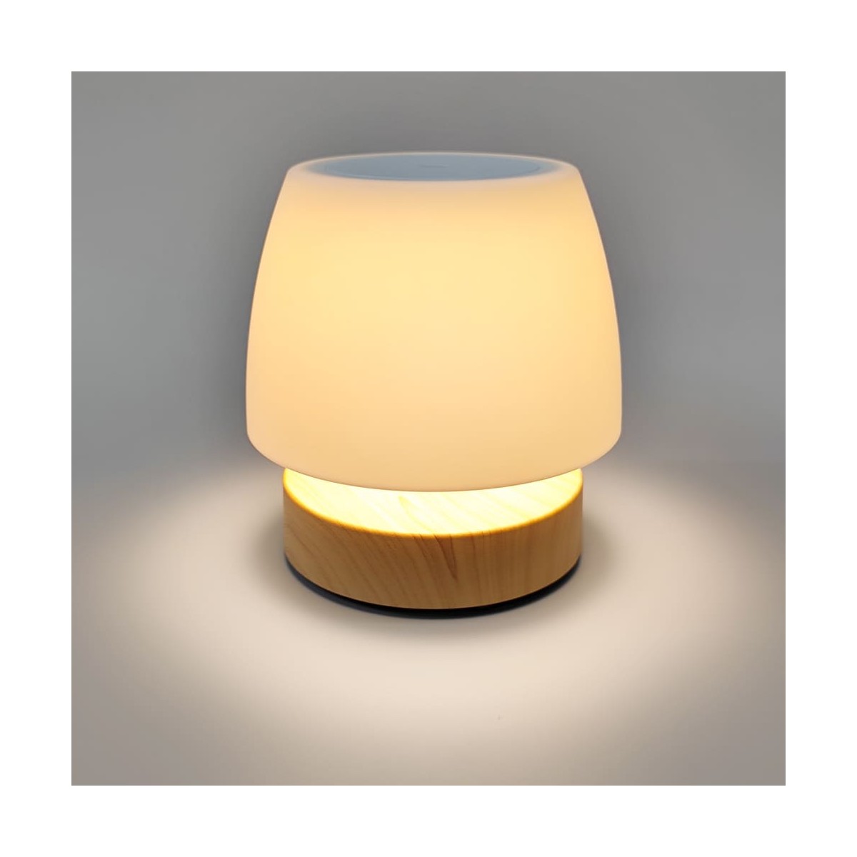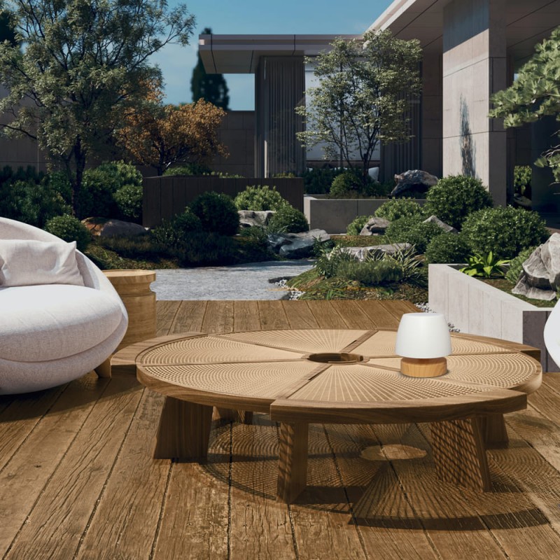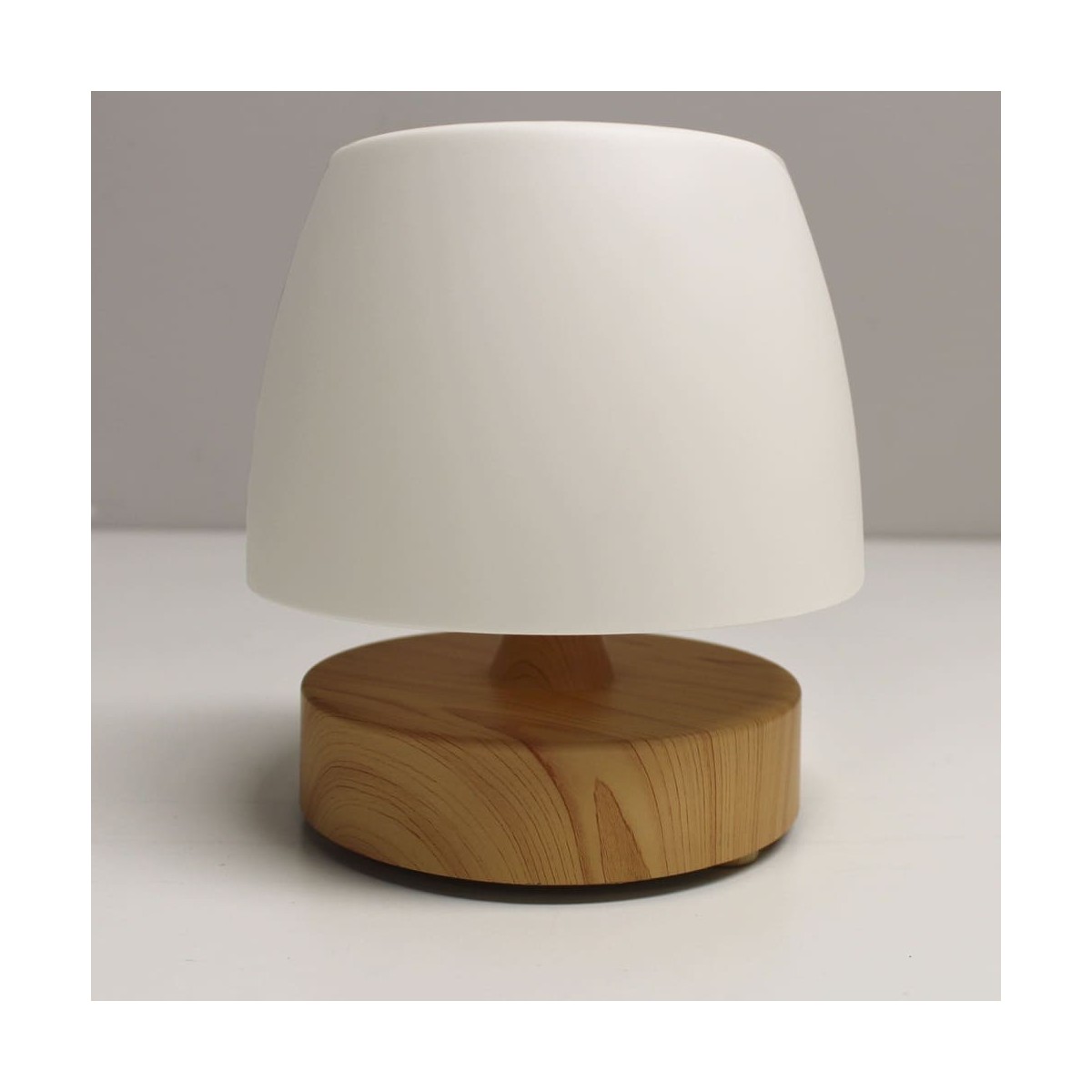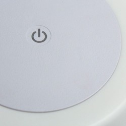 Small LED table lamp with rechargeable battery. Portable LED lamp very practical for use on tables on terraces, gardens and balconies as a light for dinners and meetings with friends. It has integrated dimmable LED lighting and is easily switched on and off by pressing on the top of the lamp. The base is made of wood-effect ABS and the diffuser is made of white polycarbonate creating a uniform light. You can use it without the need for a plug as it has a rechargeable battery with autonomy of up to 8 hours.