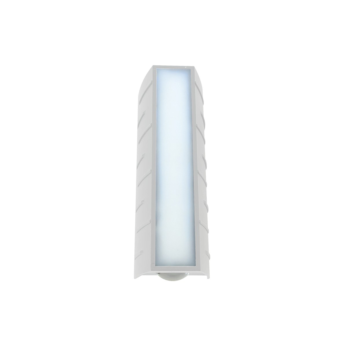 Outdoor wall light with warm light. Wall light with IP54 designed to illuminate balconies, terraces and gardens. Made of white aluminium with acrylic diffuser. The light is emitted both upwards and downwards (2x1W) as well as from the front (8W) through the diffuser. Integrated LED lighting in warm white (3000K).