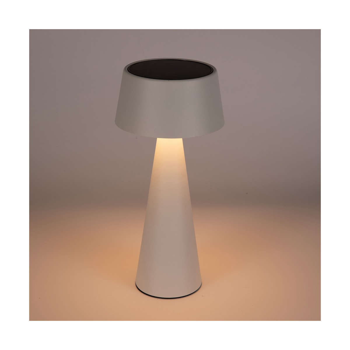 Allua rechargeable battery-powered table lamp. Modern table lamp designed to provide warm lighting for outdoor dinners and gatherings. The light is easily turned on by pressing the top of the lamp, and the intensity can also be adjusted. The head is magnetic and can be detached from the base. You can charge the lamp's battery by connecting it to the mains or using sunlight thanks to its solar panel.