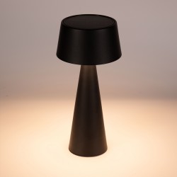 Allua rechargeable battery-powered table lamp. Modern table lamp designed to provide warm lighting for outdoor dinners and gatherings. The light is easily turned on by pressing the top of the lamp, and the intensity can also be adjusted. The head is magnetic and can be detached from the base. You can charge the lamp's battery by connecting it to the mains or using sunlight thanks to its solar panel.