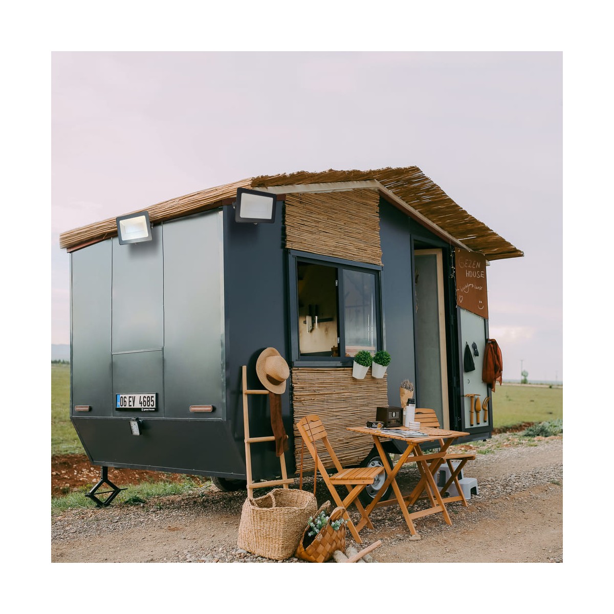 12V outdoor waterproof LED floodlight. Requires connection to a solar panel or battery, not included with the projector, for its operation. Neutral light of 4000K with a power of 50W, luminous flux of 80lm/W. This extra flat projector is designed for outdoor use, easy to transport due to its dimensions and weight.