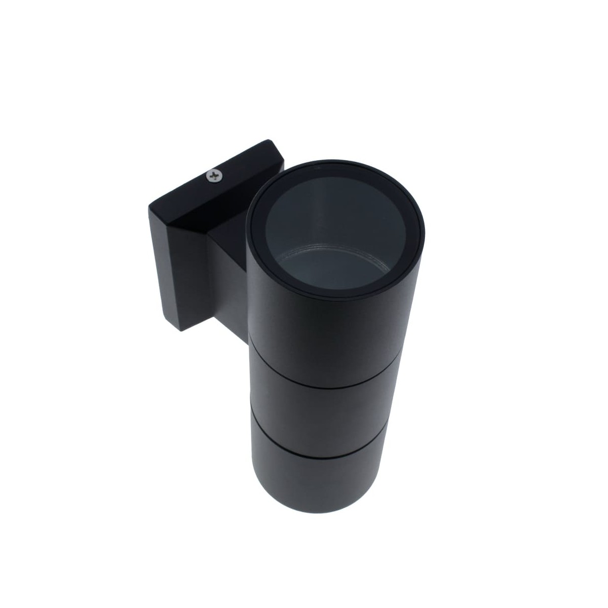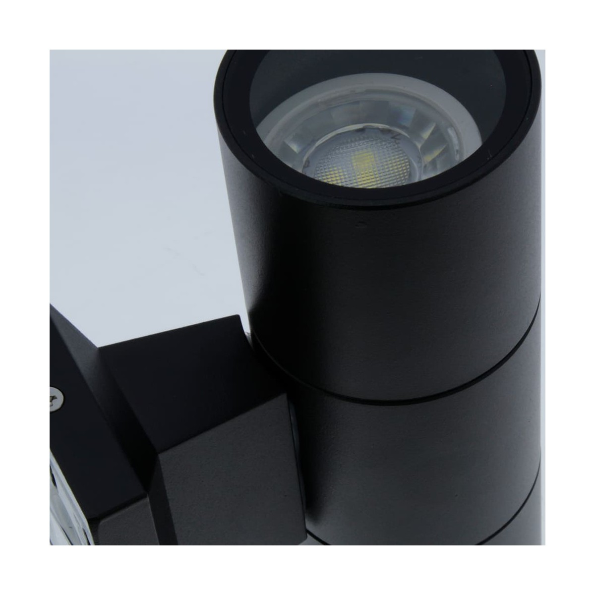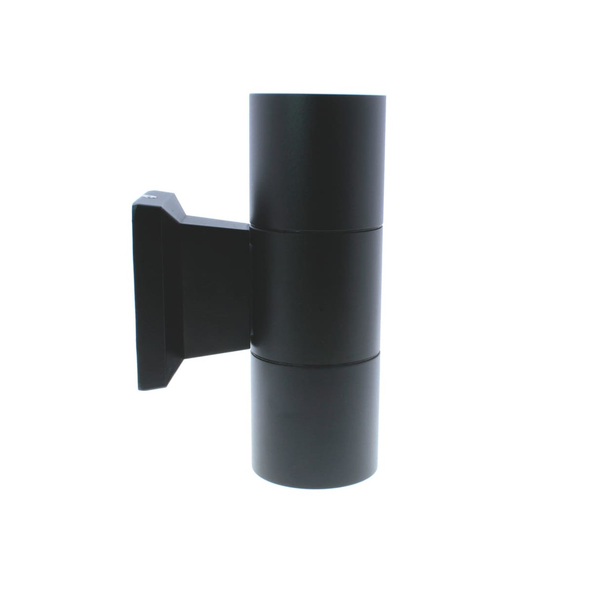 Wall light with two lights suitable for both indoor and outdoor walls of terraces, gardens and porches. Water resistant to IP44. Cylindrical wall light made of aluminium with a matt textured black finish. For GU10 bulbs. The Relax model is available with one or two lights. Very easy to install and replace bulbs (not included).